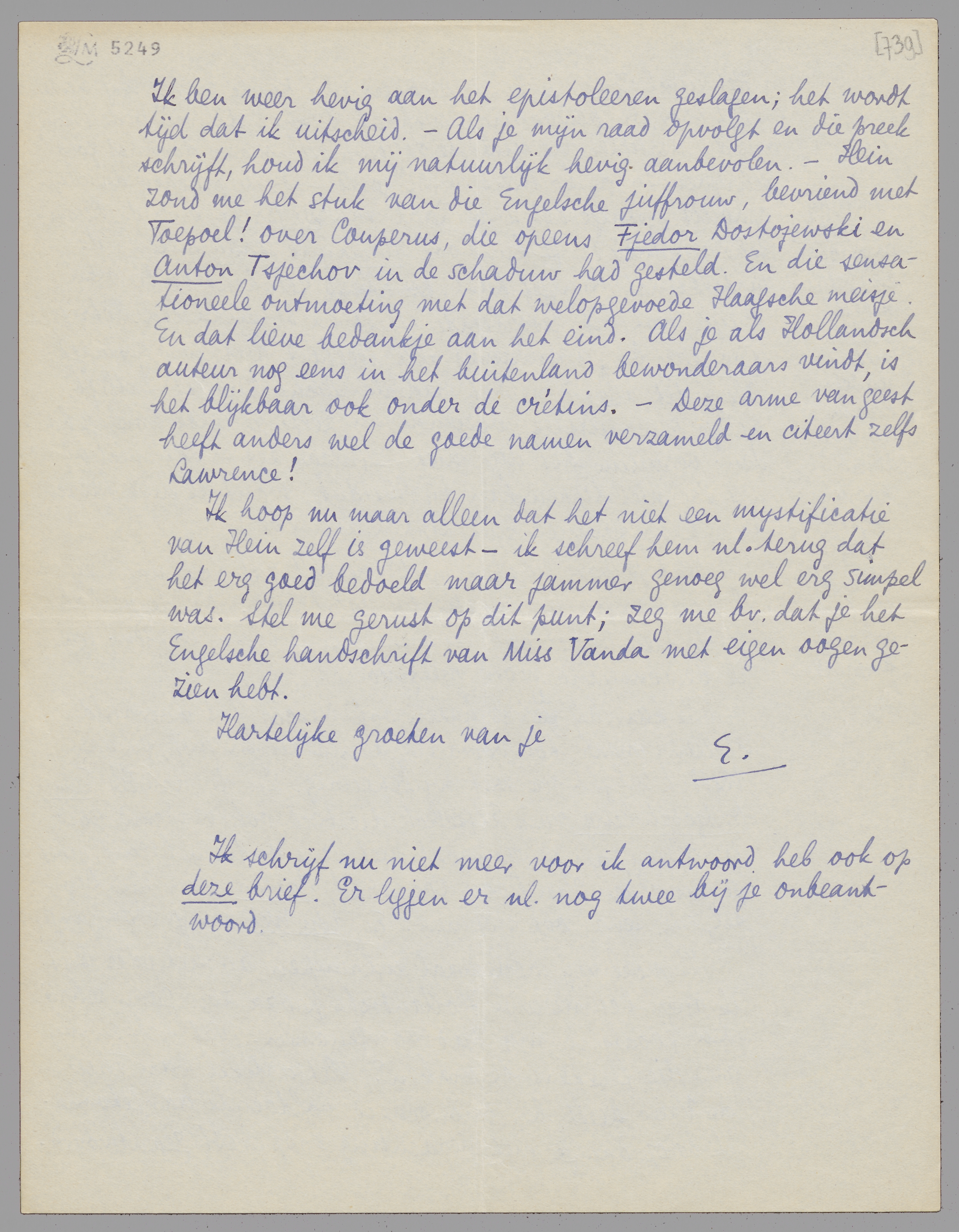 Ik hoop nu maar alleen dat het niet een mystificatie van Hein zelf is geweest - ik schreef hem nl. terug dat het erg goed bedoeld maar jammer genoeg wel erg simpel was. Stel me gerust op dit punt; zeg me bv. dat je het Engelsche handschrift van Miss Vanda met eigen oogen gezien hebt.
