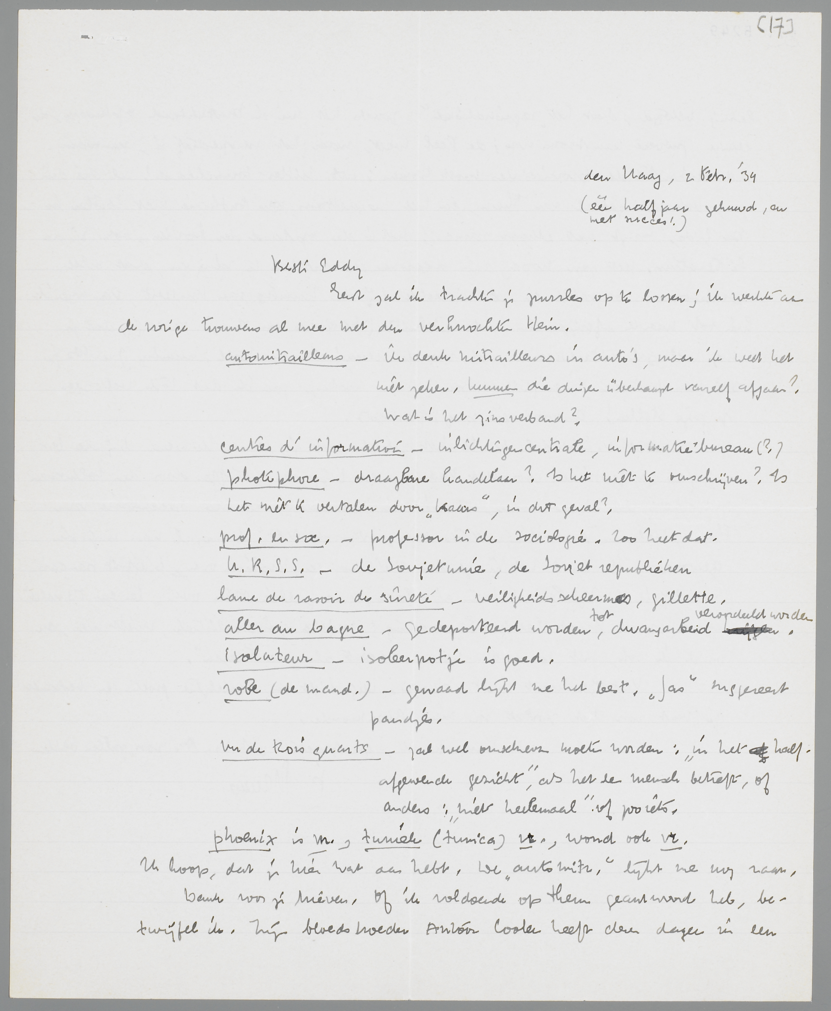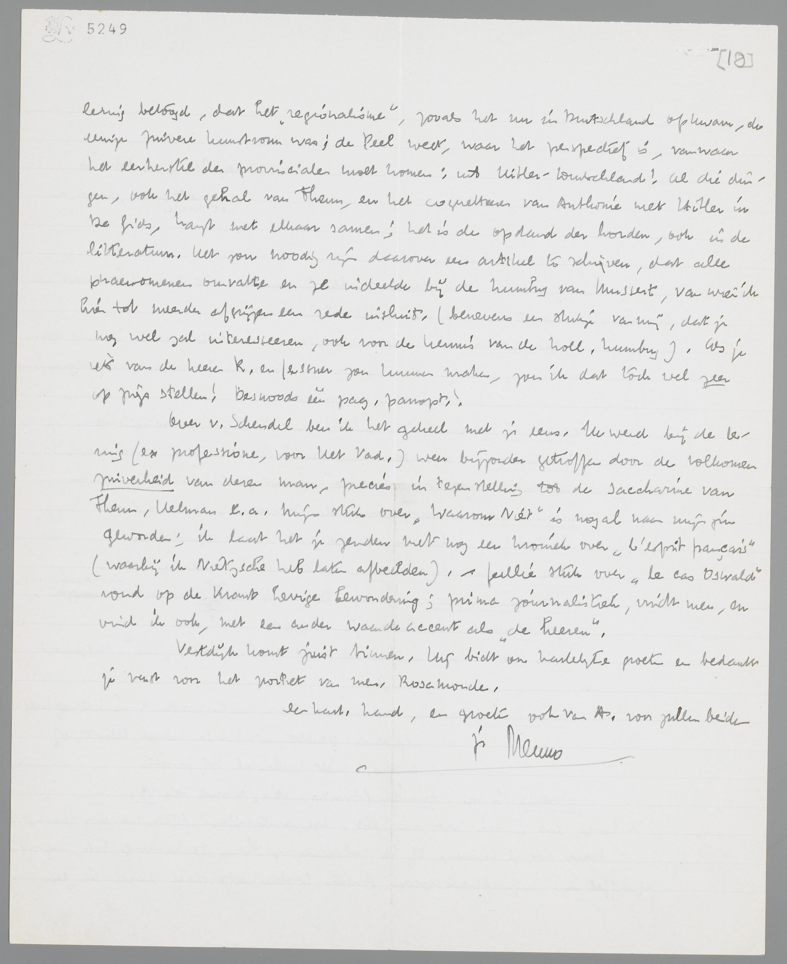 Dank voor je brieven. Of ik voldoende op Theun geantwoord heb, betwijfel ik. Zijn bloedsbroeder Antoon Coolen heeft dezer dagen in een lezing betoogd, dat het ‘regionalisme’, zooals het nu in Duitschland opkwam, de eenige zuivere kunstvorm was; de Peel weet, waar het perspectief is, vanwaar het eerherstel der provincialen moet komen: uit Hitler-Duitschland! Al die dingen, ook het gebral van Theun, en het coquetteeren van Anthonie met Hitler in De Gids, hangt met elkaar samen; het is de opstand der horden, ook in de litteratuur. Het zou noodig zijn daarover een artikel te schrijven, dat alle phaenomenen omvatte en ze indeelde bij de humbug van Mussert, van wien ik hier tot meerder afgrijzen een rede insluit. (benevens een stukje van mij, dat je nog wel zal interesseeren, ook voor de kennis van de holl. humbug). Als je iets van de heeren R. en Jessner zou kunnen maken, zou ik dat toch wel zeer op prijs stellen! Desnoods één pag. panopt.!