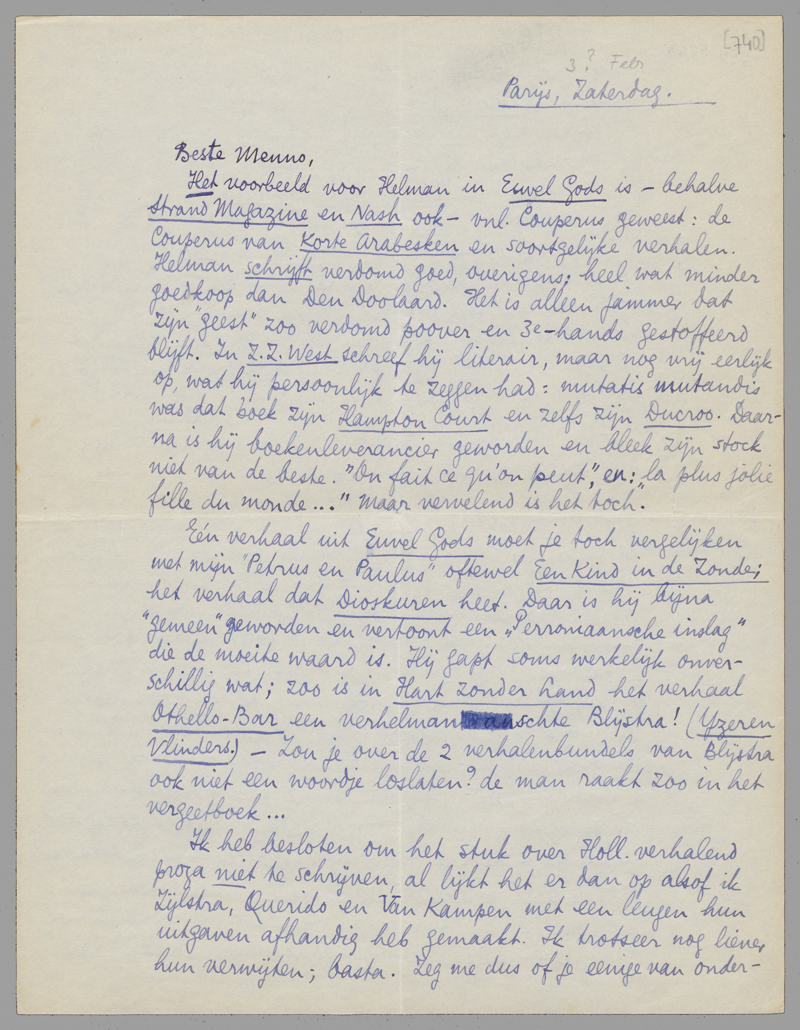 Eén verhaal uit Euvel Gods moet je toch vergelijken met mijn ‘Petrus en Paulus’ oftewel Een Kind in de Zonde; het verhaal dat Dioskuren heet. Daar is hij bijna ‘gemeen’ geworden en vertoont een ‘Perroniaansche inslag’ die de moeite waard is. Hij gapt soms werkelijk onverschillig wat; zoo is in Hart zonder Land het verhaal Othello-Bar een verhelmanschte Blijstra! (IJzeren Vlinders.) - Zou je over de 2 verhalenbundels van Blijstra ook niet een woordje loslaten? de man raakt zoo in het vergeetboek...