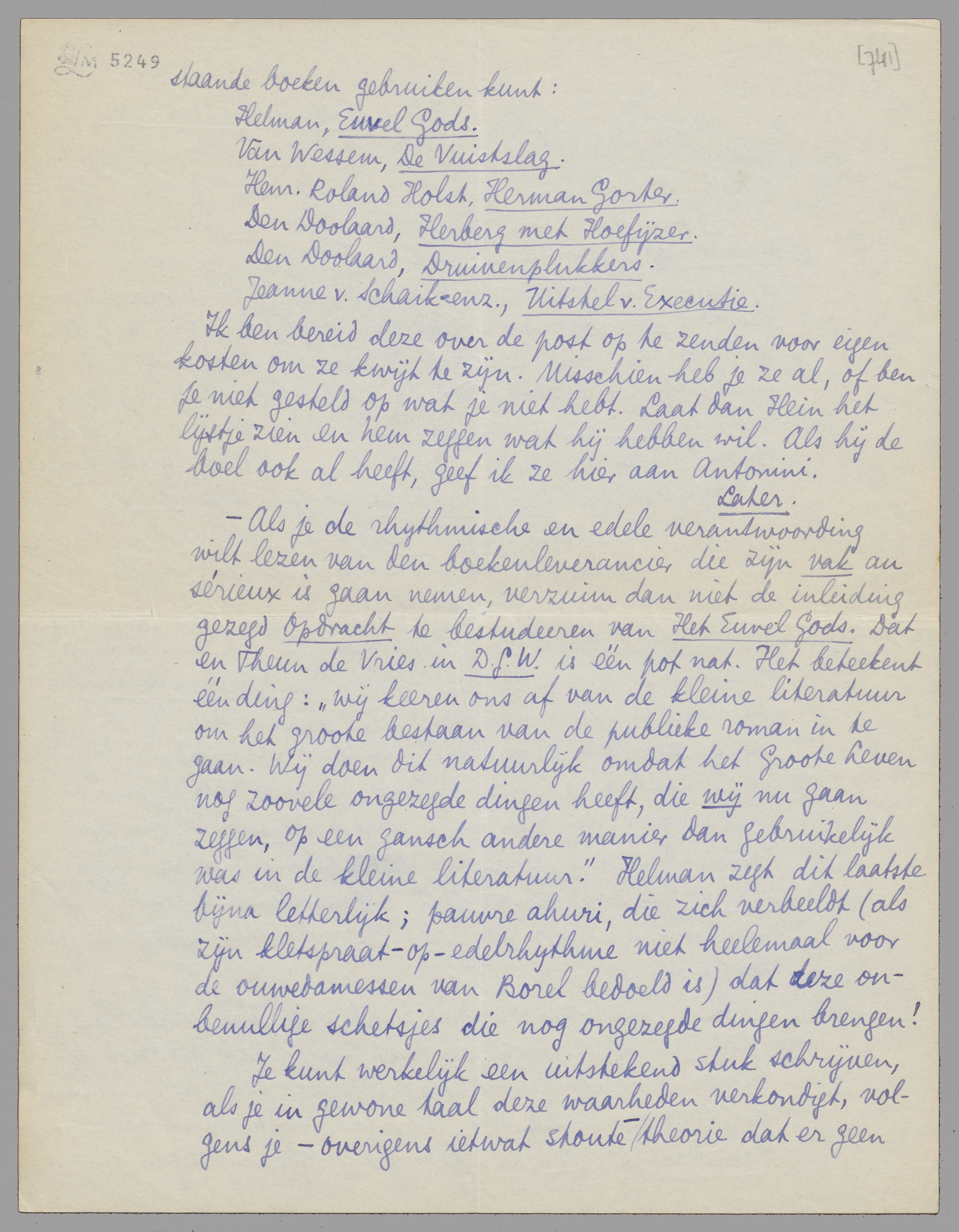 - Als je de rhythmische en edele verantwoording wilt lezen van den boekenleverancier die zijn vak au sérieux is gaan nemen, verzuim dan niet de inleiding gezegd Opdracht te bestudeeren van Het Euvel Gods. Dat en Theun de Vries in D.G.W. is één pot nat. Het beteekent één ding: ‘wij keeren ons af van de kleine literatuur om het groote bestaan van de publieke roman in te gaan. Wij doen dit natuurlijk omdat het Groote Leven nog zoovele ongezegde dingen heeft, die wij nu gaan zeggen, op een gansch andere manier dan gebruikelijk was in de kleine literatuur’. Helman zegt dit laatste bijna letterlijk; pauvre ahuri, die zich verbeeldt (als zijn kletspraat-op-edelrhythme niet heelemaal voor de ouwedamessen van Borel bedoeld is) dat deze onbenullige schetsjes die nog ongezegde dingen brengen!