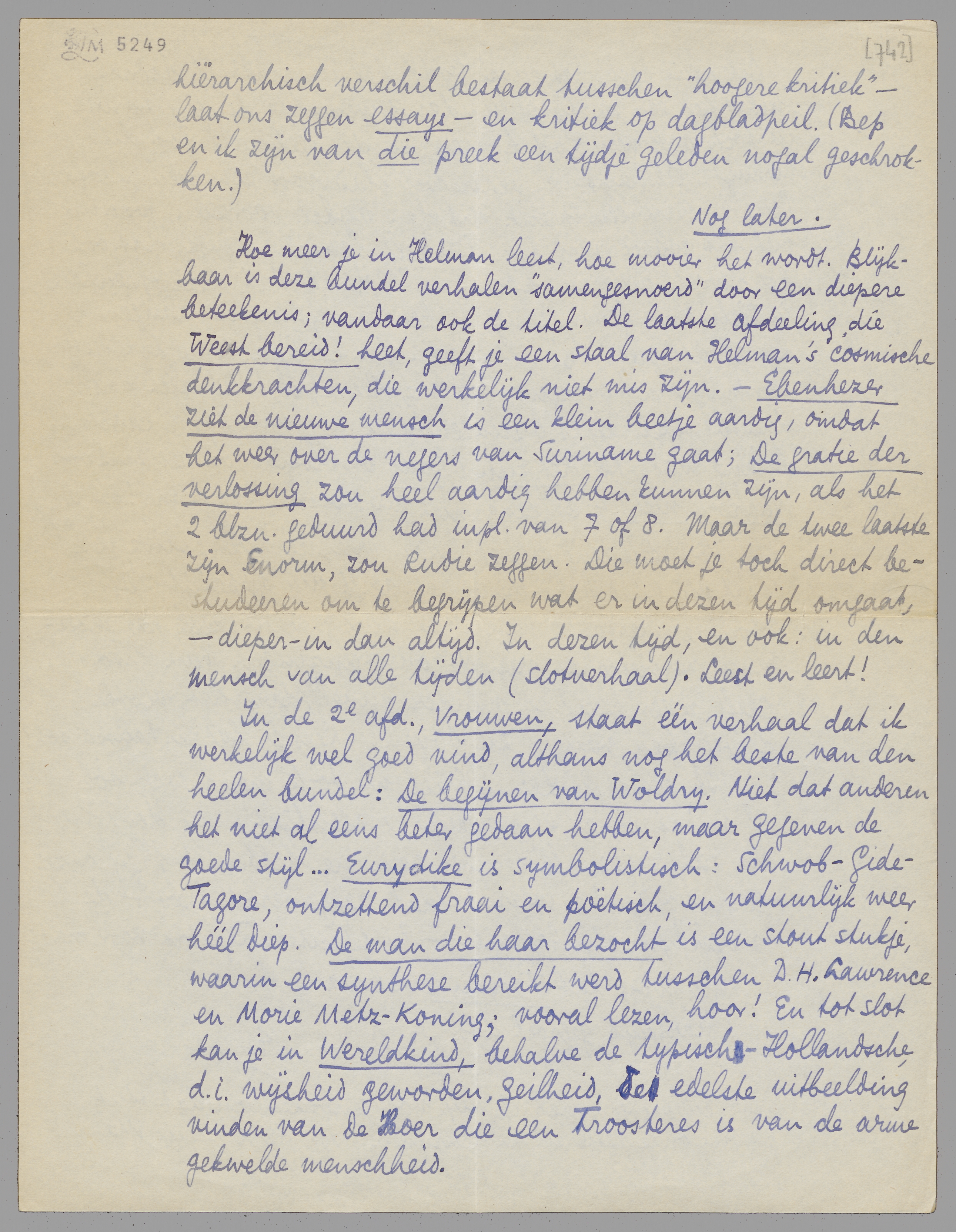 In de 2e afd., Vrouwen, staat één verhaal dat ik werkelijk wel goed vind, althans nog het beste van den heelen bundel: De begijnen van Woldry. Niet dat anderen het niet al eens beter gedaan hebben, maar gegeven de goede stijl... Eurydike is symbolistisch: Schwob-Gide-Tagore, ontzettend fraai en poëtisch, en natuurlijk weer héél diep. De man die haar bezocht is een stout stukje, waarin een synthese bereikt werd tusschen D.H. Lawrence en Marie Metz-Koning; vooral lezen, hoor! En tot slot kan je in Wereldkind, behalve de typisch-Hollandsche d.i. wijsheid geworden, geilheid, de edelste uitbeelding vinden van de Hoer die een Troosteres is van de arme gekwelde menschheid.