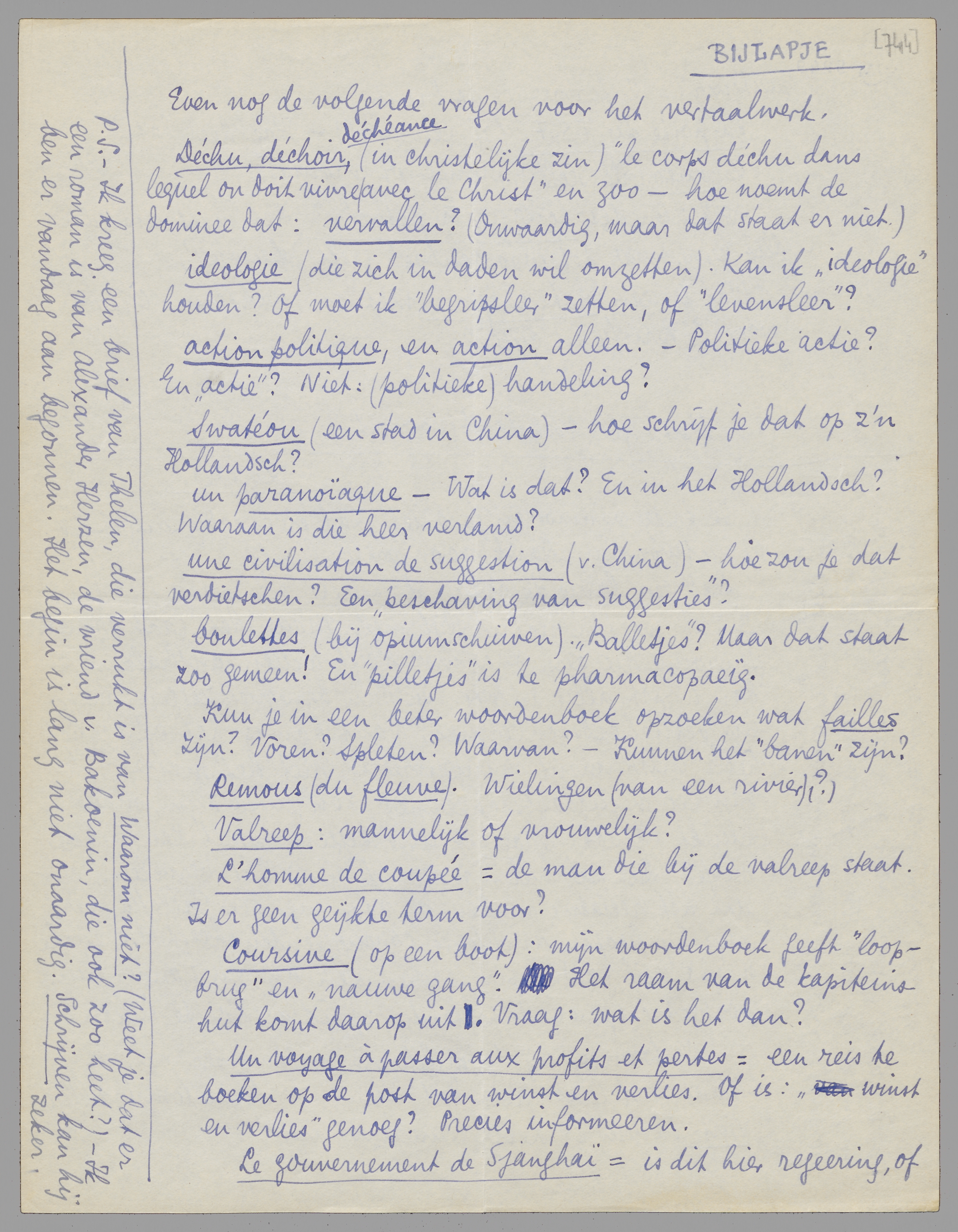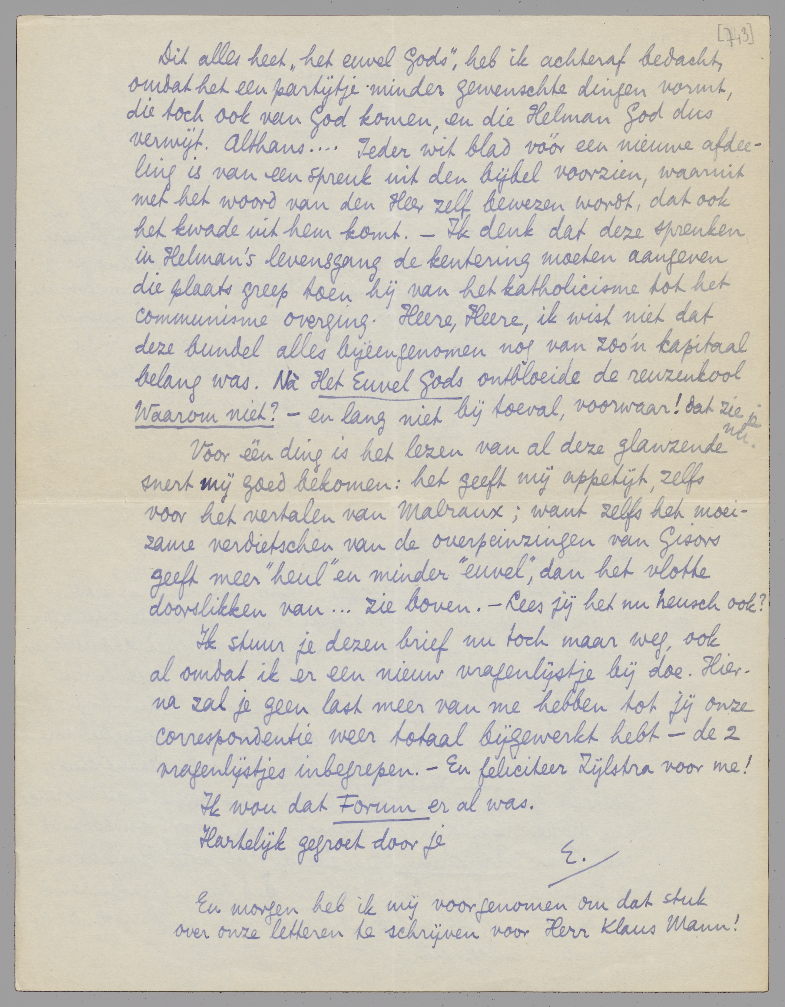 Voor één ding is het lezen van al deze glanzende snert mij goed bekomen: het geeft mij appetijt, zelfs voor het vertalen van Malraux; want zelfs het moeizame verdietschen van de overpeinzingen van Gisors geeft méér ‘heul’ en minder ‘euvel’, dan het vlotte doorslikken van... zie boven. - Lees jij het nu heusch ook?