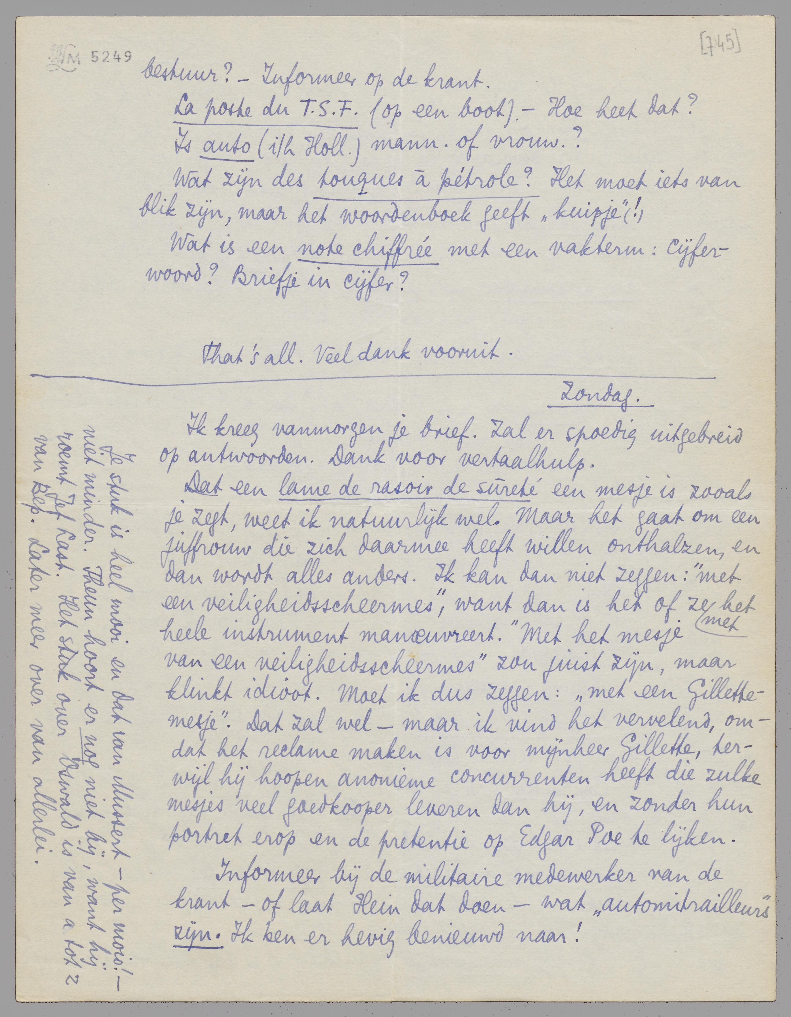 Dat een lame de rasoir de sûreté een mesje is zooals je zegt, weet ik natuurlijk wel. Maar het gaat om een juffrouw die zich daarmee heeft willen onthalzen, en dan wordt alles anders. Ik kan dan niet zeggen: ‘met een veiligheidsscheermes’, want dan is het of ze met het heele instrument manoeuvreert. ‘Met het mesje van een veiligheidsscheermes’ zou juist zijn, maar klinkt idioot. Moet ik dus zeggen: ‘met een Gillettemesje’. Dat zal wel - maar ik vind het vervelend, omdat het reclame maken is voor mijnheer Gillette, terwijl hij hoopen anonieme concurrenten heeft die zulke mesjes veel goedkooper leveren dan hij, en zonder hun portret erop en de pretentie op Edgar Poe te lijken.