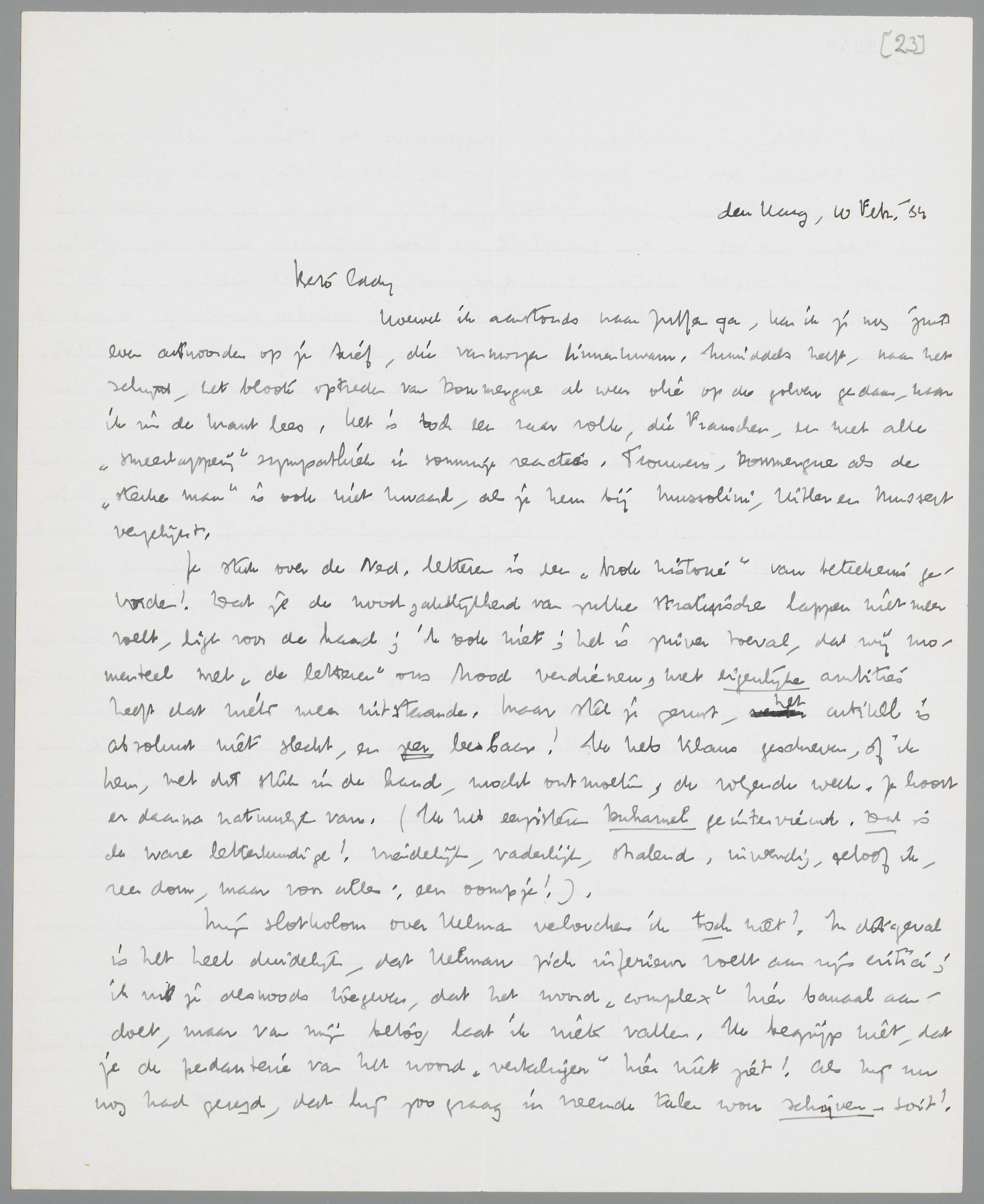 Hoewel ik aanstonds naar Zutfen ga, kan ik je nog juist even antwoorden op je brief, die vanmorgen binnenkwam. Inmiddels heeft, naar het schijnt, het bloote optreden van Doumergue al weer olie op de golven gedaan, naar ik in de krant lees. Het is toch een raar volk, die Franschen, en met alle ‘smeerlapperij’ sympathiek in sommige reacties. Trouwens, Doumergue als de ‘sterke man’ is ook niet kwaad, als je hem bij Mussolini, Hitler en Mussert vergelijkt.
