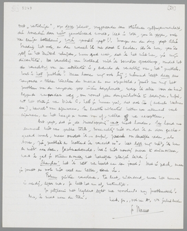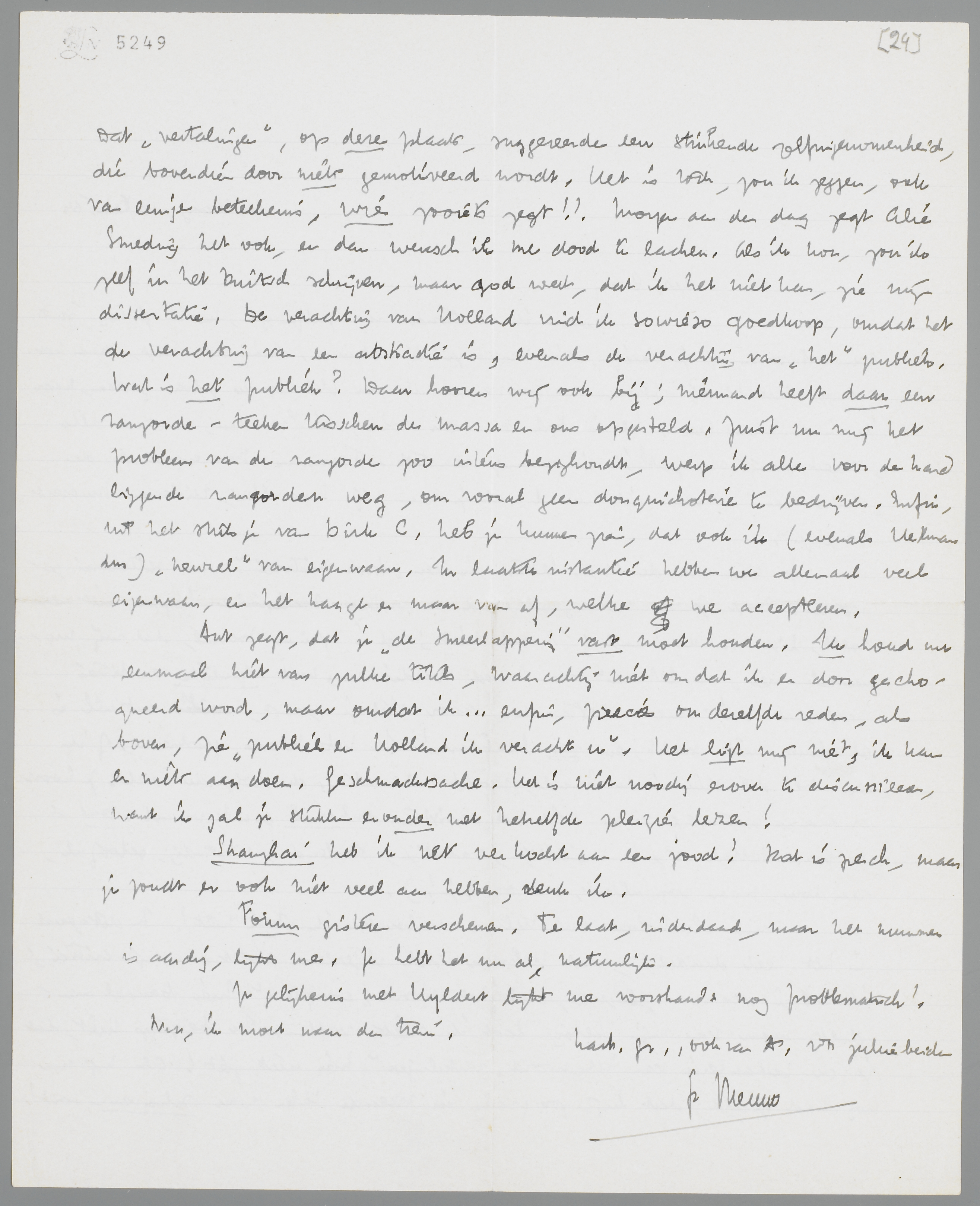 Mijn slotkolom over Helman verloochen ik toch niet! In dit geval is het heel duidelijk, dat Helman zich inferieur voelt aan zijn critici; ik wil je desnoods toegeven, dat het woord ‘complex’ hier banaal aandoet, maar van mijn betoog laat ik niets vallen. Ik begrijp niet, dat je de pedanterie van het woord ‘vertalingen’ hier niet ziet! Als hij nu nog had gezegd, dat hij zoo graag in vreemde talen wou schrijven - soit! Dat ‘vertalingen’, op deze plaats, suggereerde een stinkende zelfingenomenheid, die bovendien door niets gemotiveerd wordt. Het is toch, zou ik zeggen, ook van eenige beteekenis, wie zooiets zegt!! Morgen aan de dag zegt Alie Smeding het ook, en dan wensch ik me dood te lachen. Als ik kon, zou ik zelf in het Duitsch schrijven, maar god weet, dat ik het niet kan, zie mijn dissertatie. De verachting van Holland vind ik sowieso goedkoop, omdat het de verachting van een abstractie is, evenals de verachting van ‘het’ publiek. Wat is het publiek? Daar hooren wij ook bij; niemand heeft daar een rangorde-teeken tusschen de massa en ons opgesteld. Juist nu mij het probleem van de rangorde zoo intens bezighoudt, werp ik alle voor de hand liggende rangorden weg, om vooral geen donquichoterie te bedrijven. Enfin, uit het stukje van Dirk C. heb je kunnen zien, dat ook ik (evenals Helman dus) ‘neuzel’ van eigenwaan. In laatste instantie hebben we allemaal veel eigenwaan, en het hangt er maar van af, welke we accepteeren.