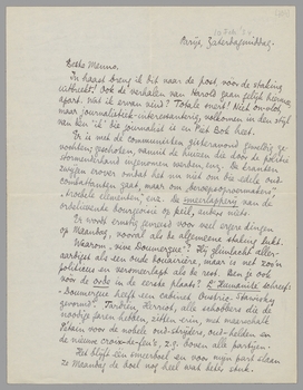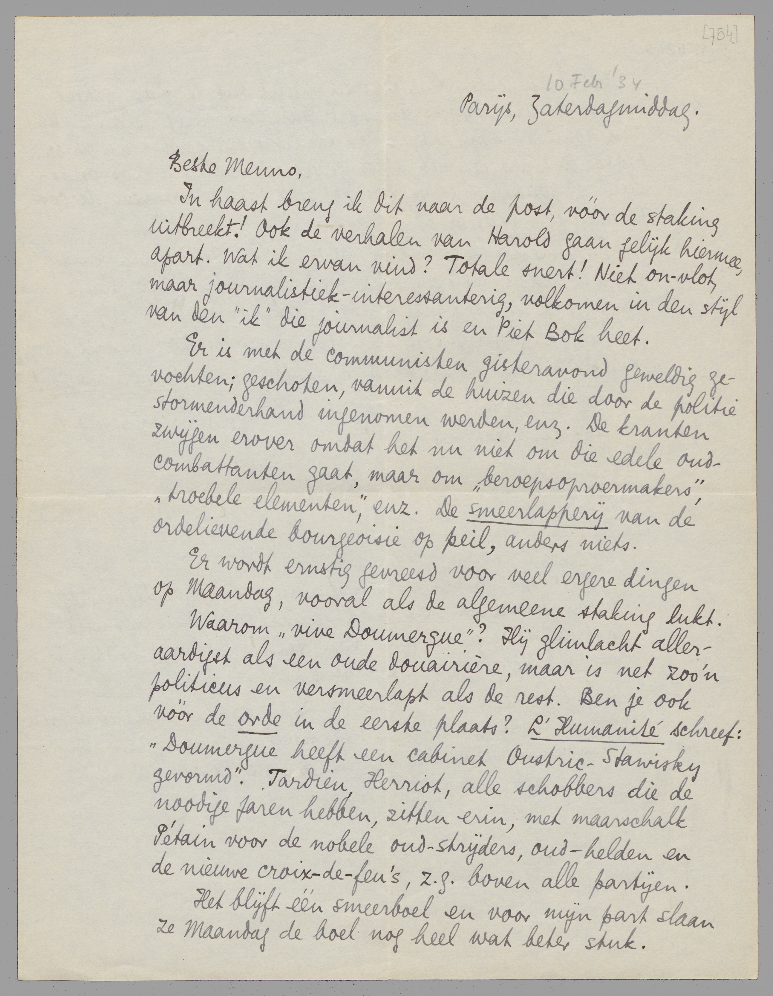 Er is met de communisten gisteravond geweldig gevochten; geschoten, vanuit de huizen die door de politie stormenderhand ingenomen werden, enz. De kranten zwijgen erover omdat het nu niet om die edele oudcombattanten gaat, maar om ‘beroepsoproermakers’, ‘troebele elementen’, enz. De smeerlapperij van de ordelievende bourgeoisie op peil, anders niets.