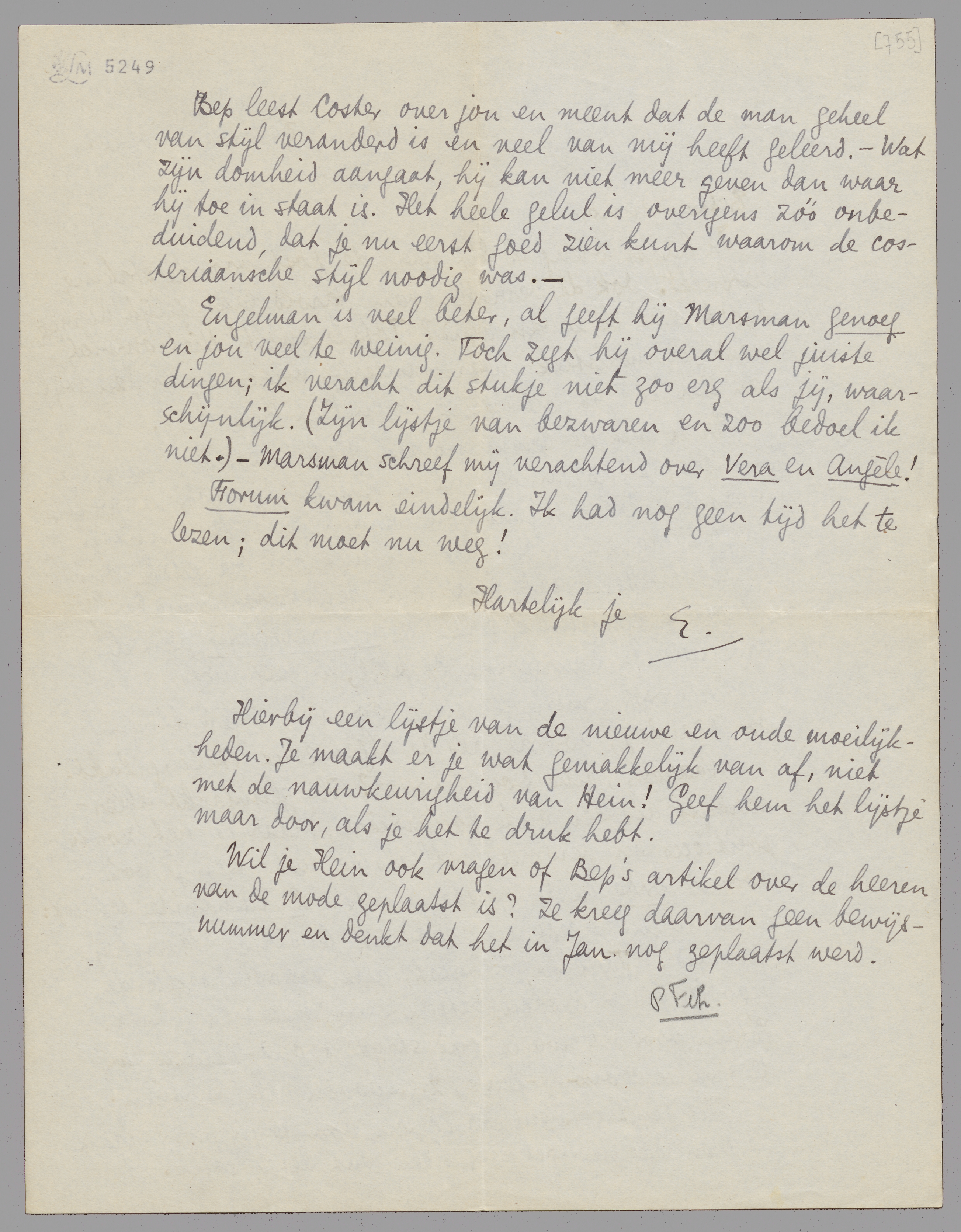 Engelman is veel beter, al geeft hij Marsman genoeg en jou veel te weinig. Toch zegt hij overal wel juiste dingen; ik veracht dit stukje niet zoo erg als jij, waarschijnlijk. (Zijn lijstje van bezwaren en zoo bedoel ik niet.) - Marsman schreef mij verachtend over Vera en Angèle!