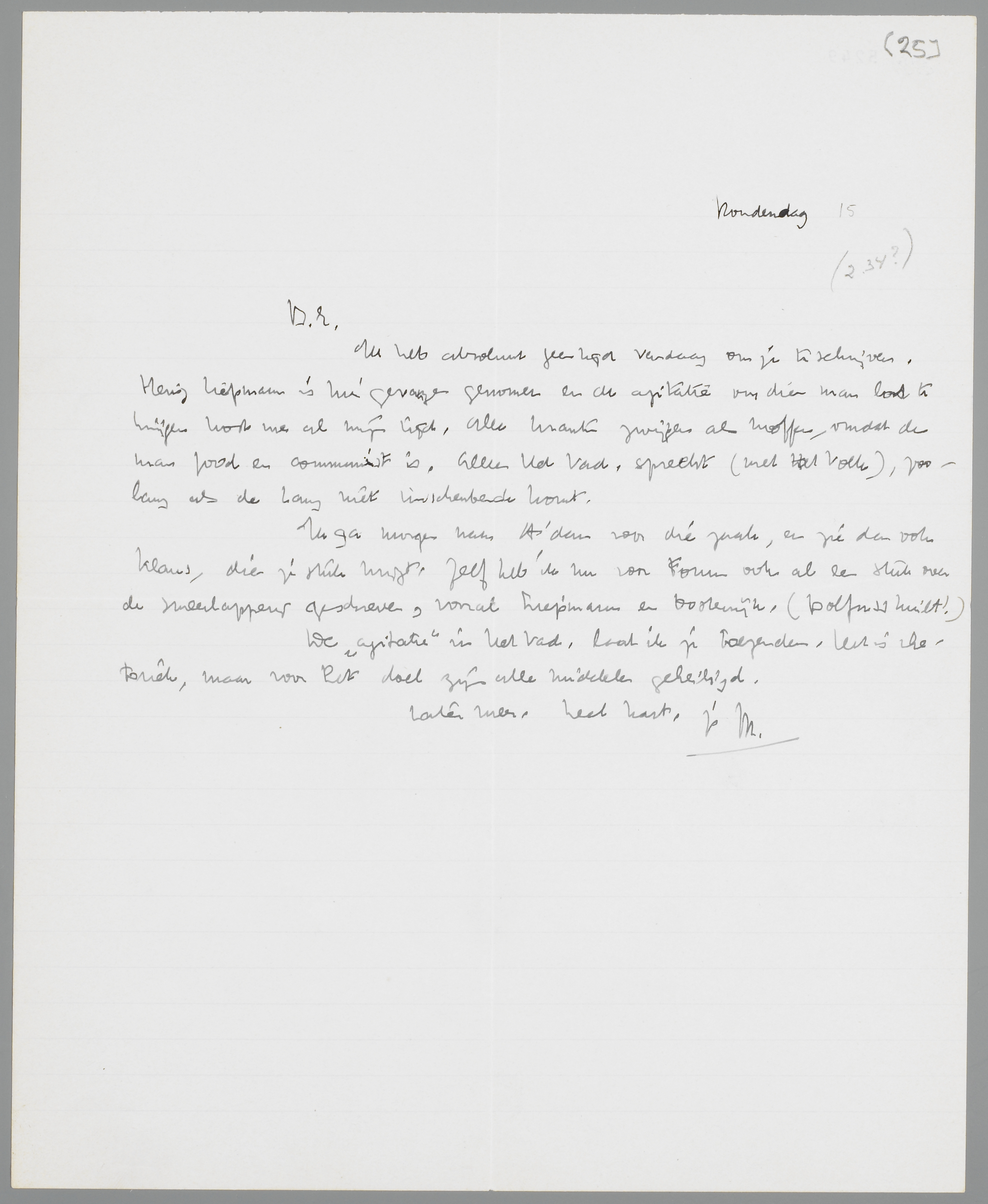 Ik heb absoluut geen tijd vandaag om je te schrijven. Heinz Liepmann is hier gevangen genomen en de agitatie om dien man los te krijgen kost me al mijn tijd. Alle kranten zwijgen als moffen, omdat de man Jood en communist is. Alleen Het Vad. spreekt (met Het Volk), zoolang als de Lang niet tusschenbeide komt.