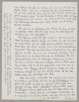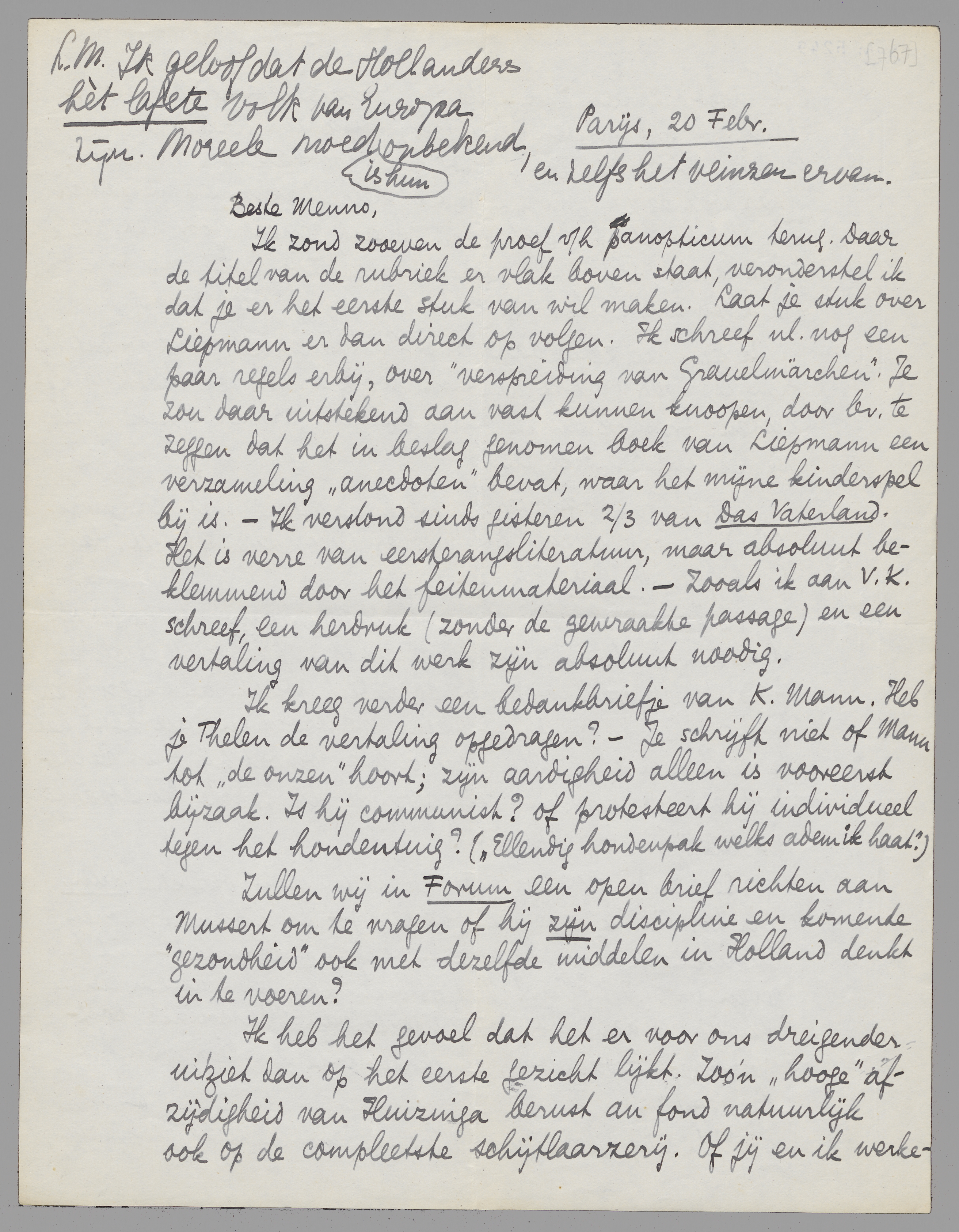 Ik zond zooeven de proef v/h panopticum terug. Daar de titel van de rubriek er vlak boven staat, veronderstel ik dat je er het eerste stuk van wil maken. Laat je stuk over Liepmann er dan direct op volgen. Ik schreef nl. nog een paar regels erbij, over ‘verspreiding van Grauelmärchen’. Je zou daar uitstekend aan vast kunnen knoopen, door bv. te zeggen dat het in beslag genomen boek van Liepmann een verzameling ‘anecdoten’ bevat, waar het mijne kinderspel bij is. - Ik verslond sinds gisteren 2/3 van Das Vaterland. Het is verre van eersterangsliteratuur, maar absoluut beklemmend door het feitenmateriaal. - Zooals ik aan V.K. schreef, een herdruk (zonder de gewraakte passage) en een vertaling van dit werk zijn absoluut noodig.
