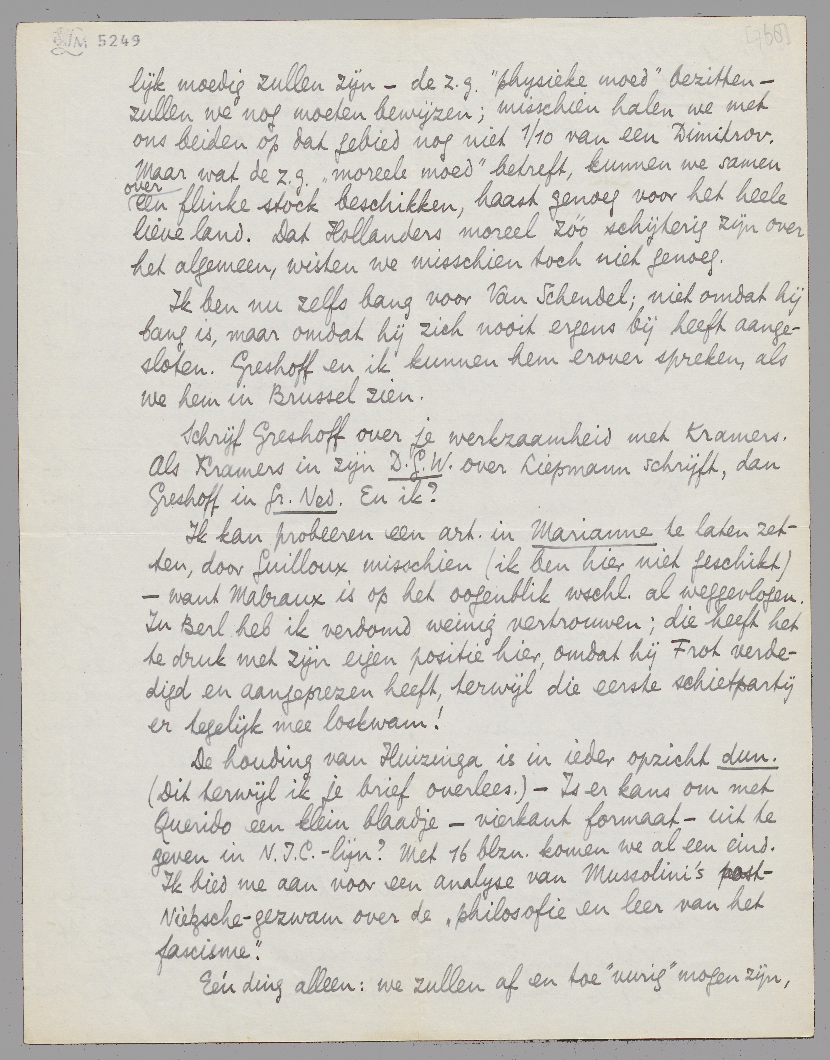 De houding van Huizinga is in ieder opzicht dun. (Dit terwijl ik je brief overlees.) - Is er kans om met Querido een klein blaadje - vierkant formaat - uit te geven in N.I.C.-lijn? Met 16 blzn komen we al een eind. Ik bied me aan voor een analyse van Mussoloni's post-Nietzsche-gezwam over de ‘philosofie en leer van het fascisme’.