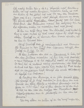 Ik heb het gevoel dat het er voor ons dreigender uitziet dan op het eerste gezicht lijkt. Zoo'n ‘hooge’ afzijdigheid van Huizinga berust au fond natuurlijk ook op de compleetste schijtlaarzerij. Of jij en ik werkelijk moedig zullen zijn - de z.g. ‘physieke moed’ bezitten - zullen we nog moeten bewijzen; misschien halen we met ons beiden op dat gebied nog niet 1/10 van een Dimitrov. Maar wat de z.g. ‘moreele moed’ betreft, kunnen we samen over een flinke stock beschikken, haast genoeg voor het heele lieve land. Dat Hollanders moreel zóó schijterig zijn over het algemeen, wisten we misschien toch niet genoeg.