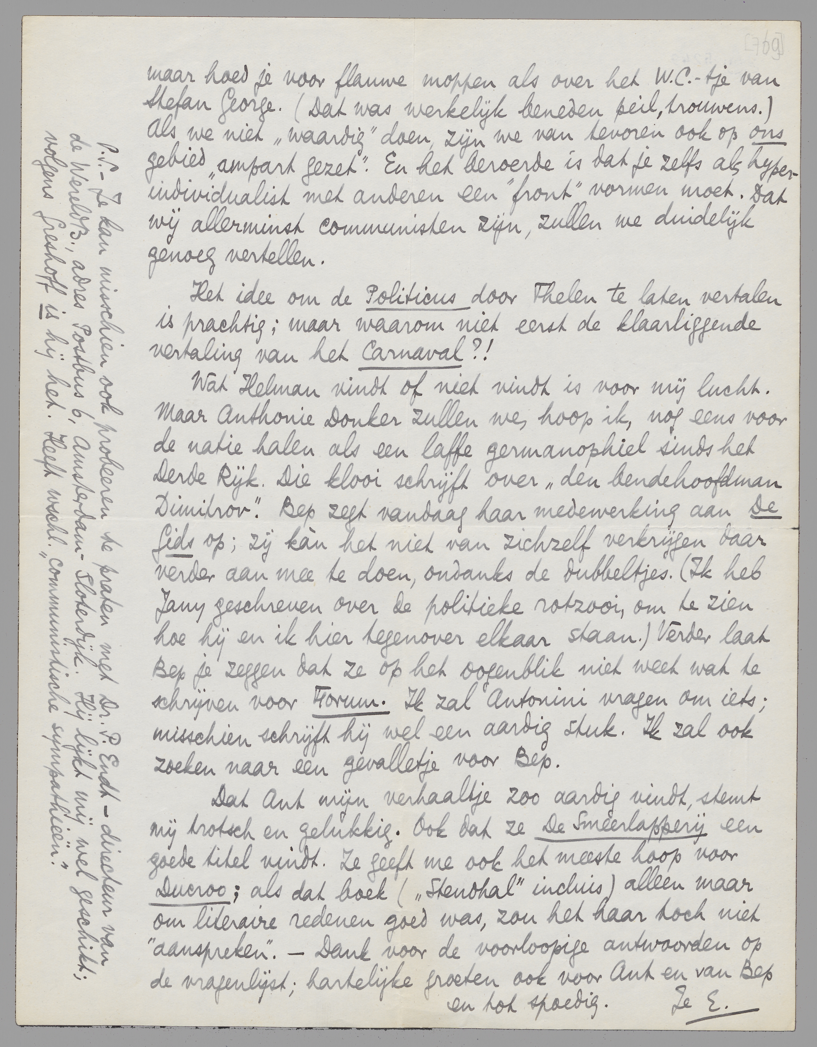 P.S. - Je kan misschien ook probeeren te praten met Dr. P. Endt - directeur van de Wereld B., adres Postbus 6, Amsterdam - Sloterdijk. Hij lijkt mij wel geschikt; volgens Greshoff is hij het. Heeft wschl. ‘communistische sympathieën’.