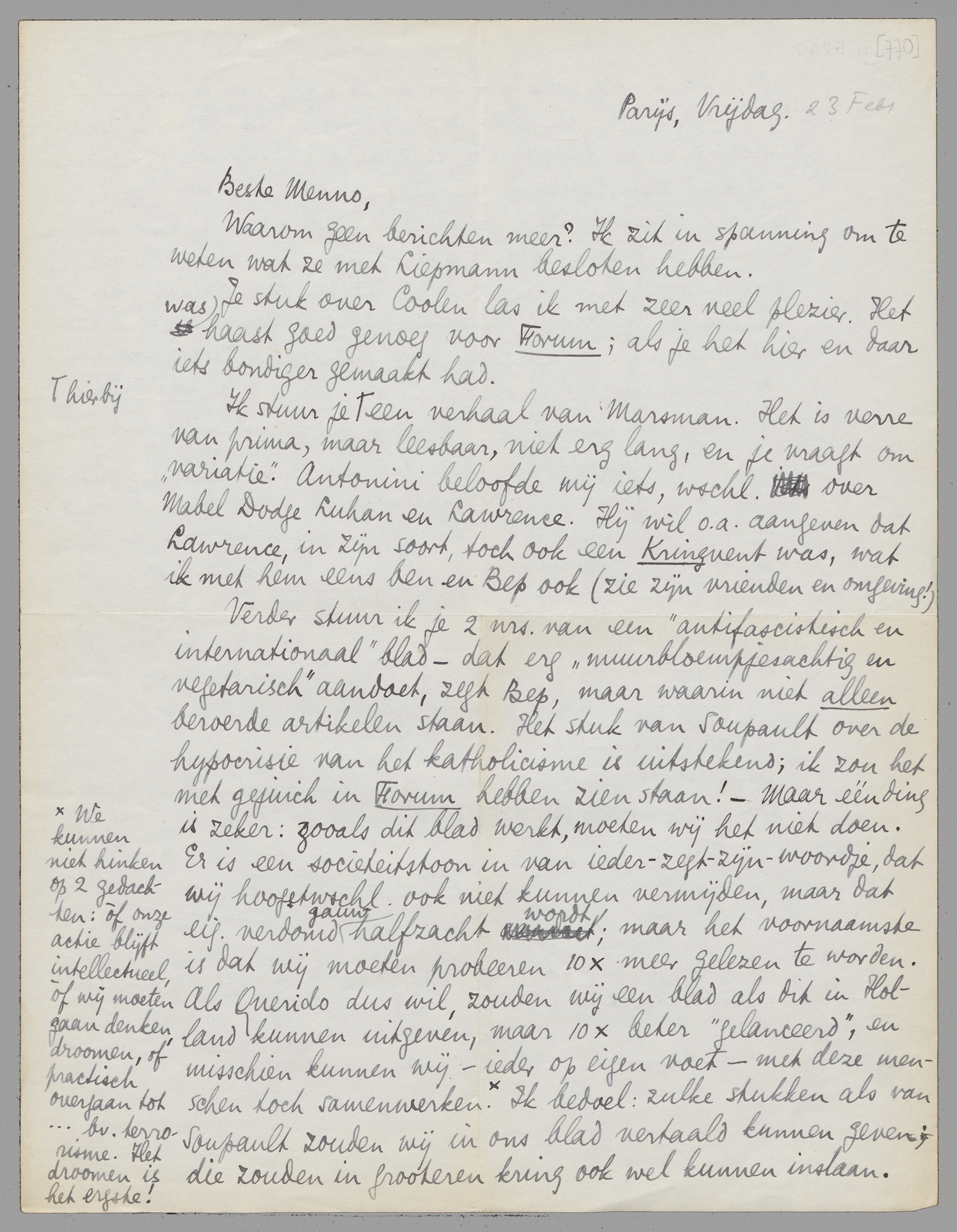 Verder stuur ik je 2 nrs. van een ‘antifascistisch en internationaal’ blad - dat erg ‘muurbloempjesachtig en vegetarisch’ aandoet, zegt Bep, maar waarin niet alleen beroerde artikelen staan. Het stuk van Soupault over de hypocrisie van het katholicisme is uitstekend; ik zou het met gejuich in Forum hebben zien staan! - Maar één ding is zeker: zooals dit blad werkt, moeten wij het niet doen. Er is een societeitstoon in van ieder-zegt-zijn-woordje, dat wij hoogstwschl. ook niet kunnen vermijden, maar dat eig. verdomd gauw halfzacht wordt; maar het voornaamste is dat wij moeten probeeren 10 × meer gelezen te worden. Als Querido dus wil, zouden wij een blad als dit in Holland kunnen uitgeven, maar 10 × beter ‘gelanceerd’, en misschien kunnen wij - ieder op eigen voet - met deze menschen toch samenwerken. [We kunnen niet hinken op twee gedachten: òf onze actie blijft intellectueel, òf wij moeten gaan denken, droomen, of practisch overgaan tot... bv. terrorisme. Het droomen is het ergste!] Ik bedoel: zulke stukken als van Soupault zouden wij in ons blad vertaald kunnen geven; die zouden in grooteren kring ook wel kunnen inslaan.