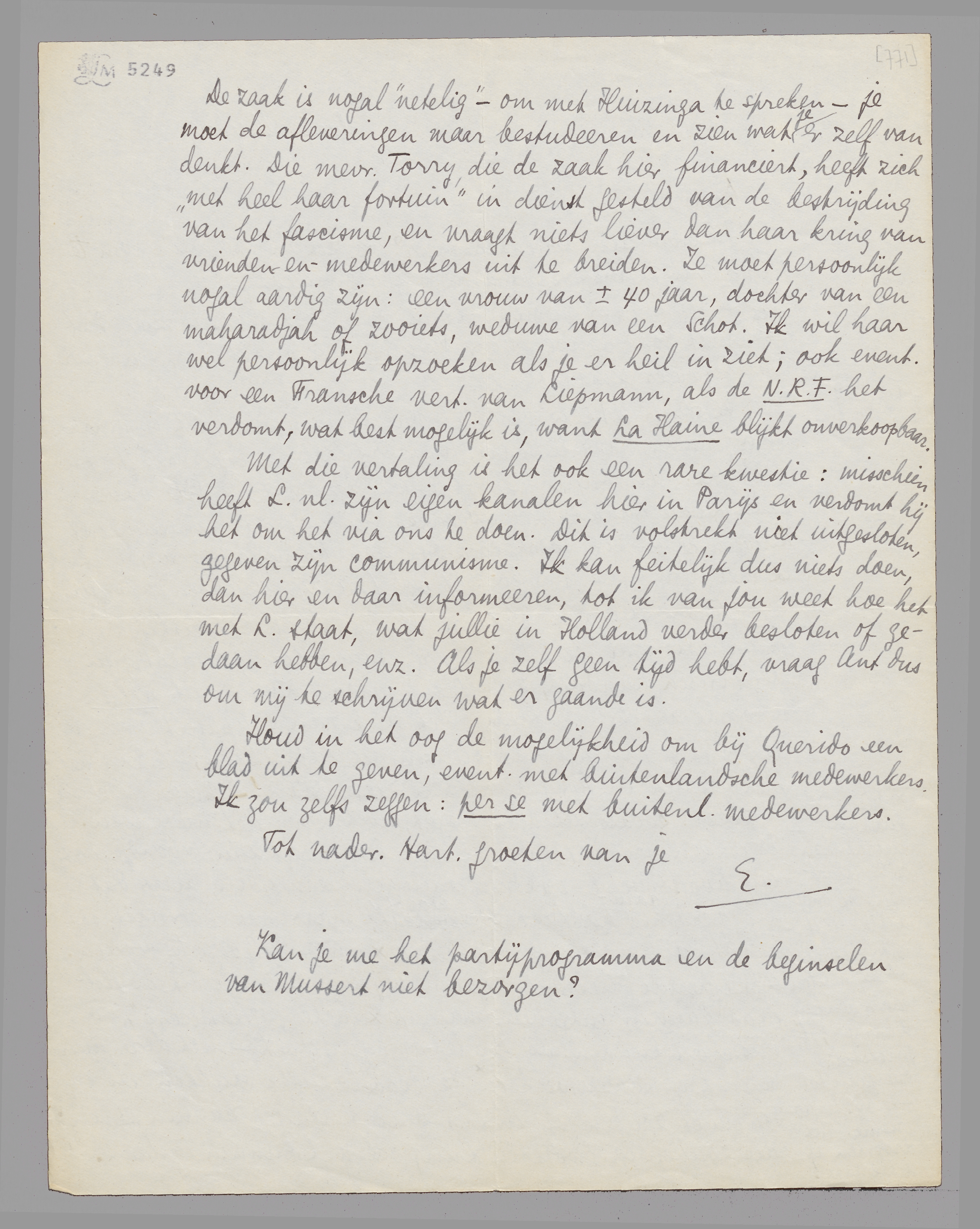 De zaak is nogal ‘netelig’ - om met Huizinga te spreken - je moet de afleveringen maar bestudeeren en zien wat je er zelf van denkt. Die mevr. Torry die de zaak hier financiert, heeft zich ‘met heel haar fortuin’ in dienst gesteld van de bestrijding van het fascisme, en vraagt niets liever dan haar kring van vrienden-en-medewerkers uit te breiden. Ze moet persoonlijk nogal aardig zijn: een vrouw van ± 40 jaar, dochter van een maharadjah of zooiets, weduwe van een Schot. Ik wil haar wel persoonlijk opzoeken als je er heil in ziet; ook event. voor een Fransche vert. van Liepmann, als de N.R.F. het verdomt, wat best mogelijk is, want La Haine blijkt onverkoopbaar.