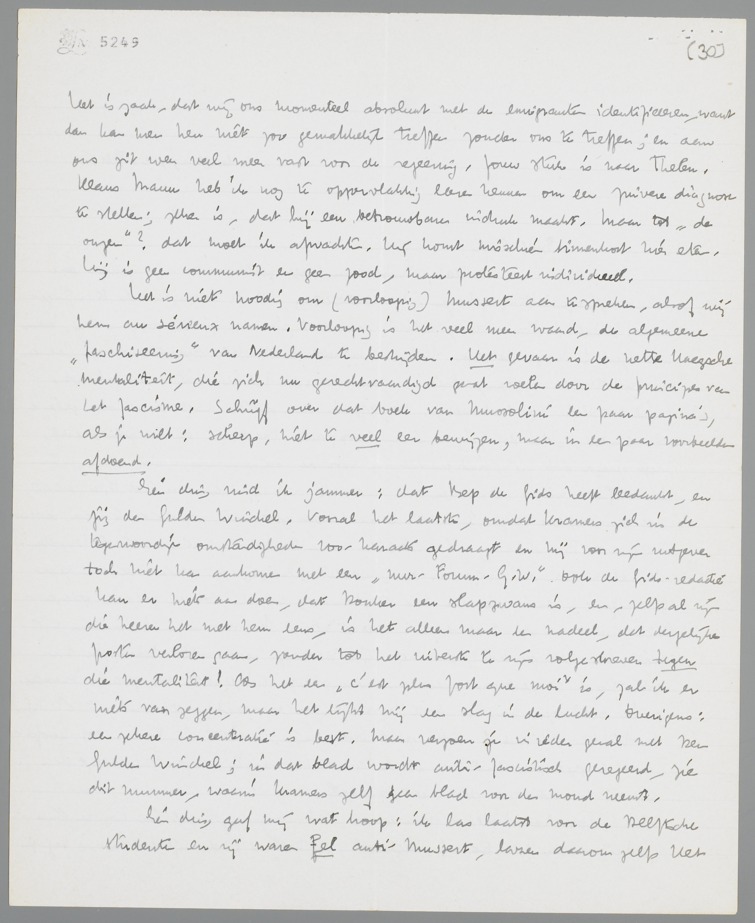 Het is niet noodig om (voorloopig) Mussert aan te spreken, alsof wij hem au sérieux namen. Voorloopig is het veel meer waard, de algemeene ‘faschiseering’ van Nederland te bestrijden. Het gevaar is de nette Haegsche mentaliteit, die zich nu gerechtvaardigd gaat voelen door de principes van het fascisme. Schrijf over dat boek van Mussolini een paar pagina's, als je wilt: scherp, niet te veel eer bewijzen, maar in een paar voorbeelden afdoend.