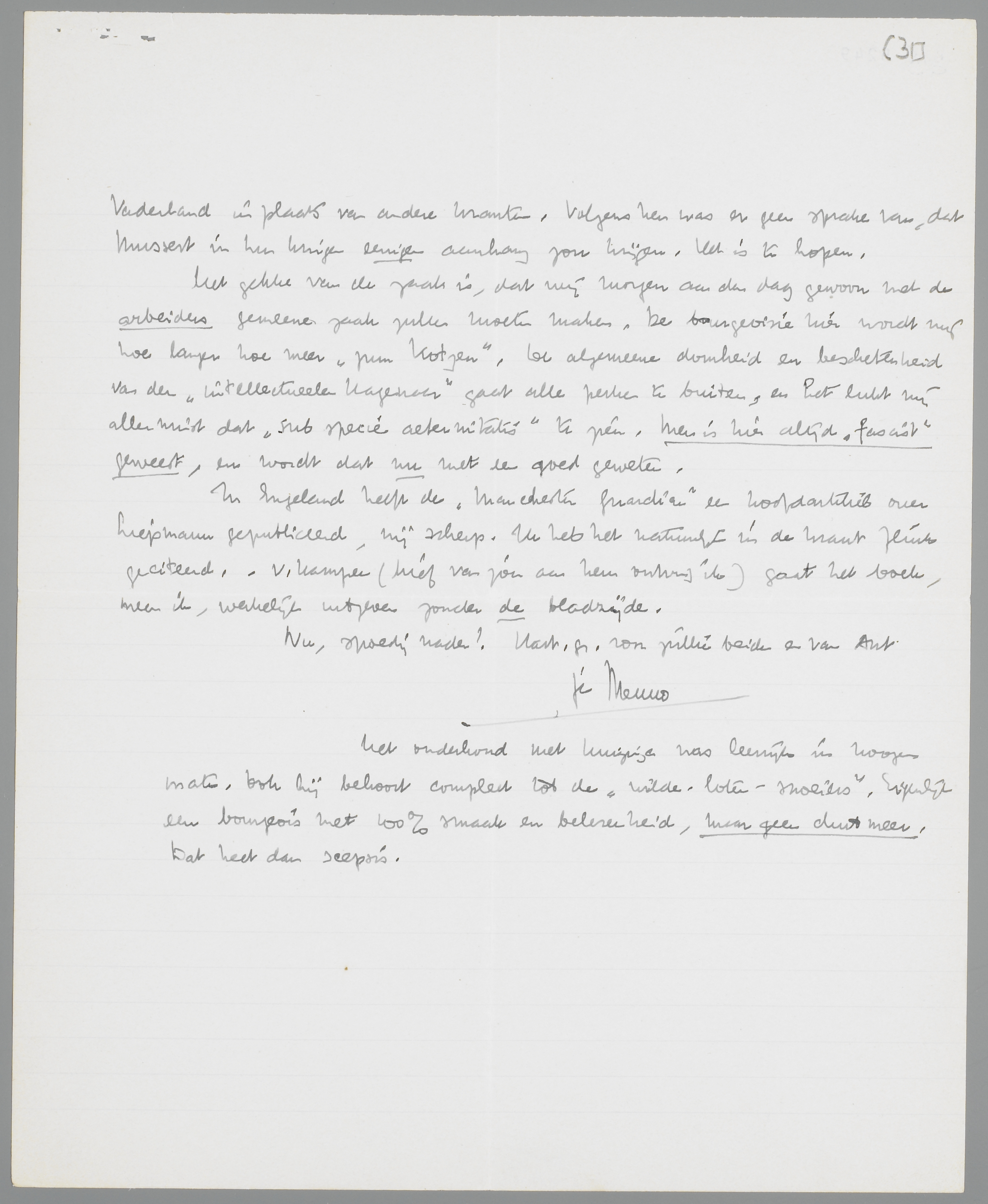 Het gekke van de zaak is, dat wij morgen aan den dag gewoon met de arbeiders gemeene zaak zullen moeten maken. De bourgeoisie hier wordt mij hoe langer hoe meer ‘zum Kotzen’. De algemeene domheid en beschetenheid van den ‘intellectueelen Hagenaar’ gaat alle perken te buiten, en het lukt mij allerminst dat ‘sub specie aeternitatis’ te zien. Men is hier altijd ‘fascist’ geweest, en wordt dat nu met een goed geweten.
