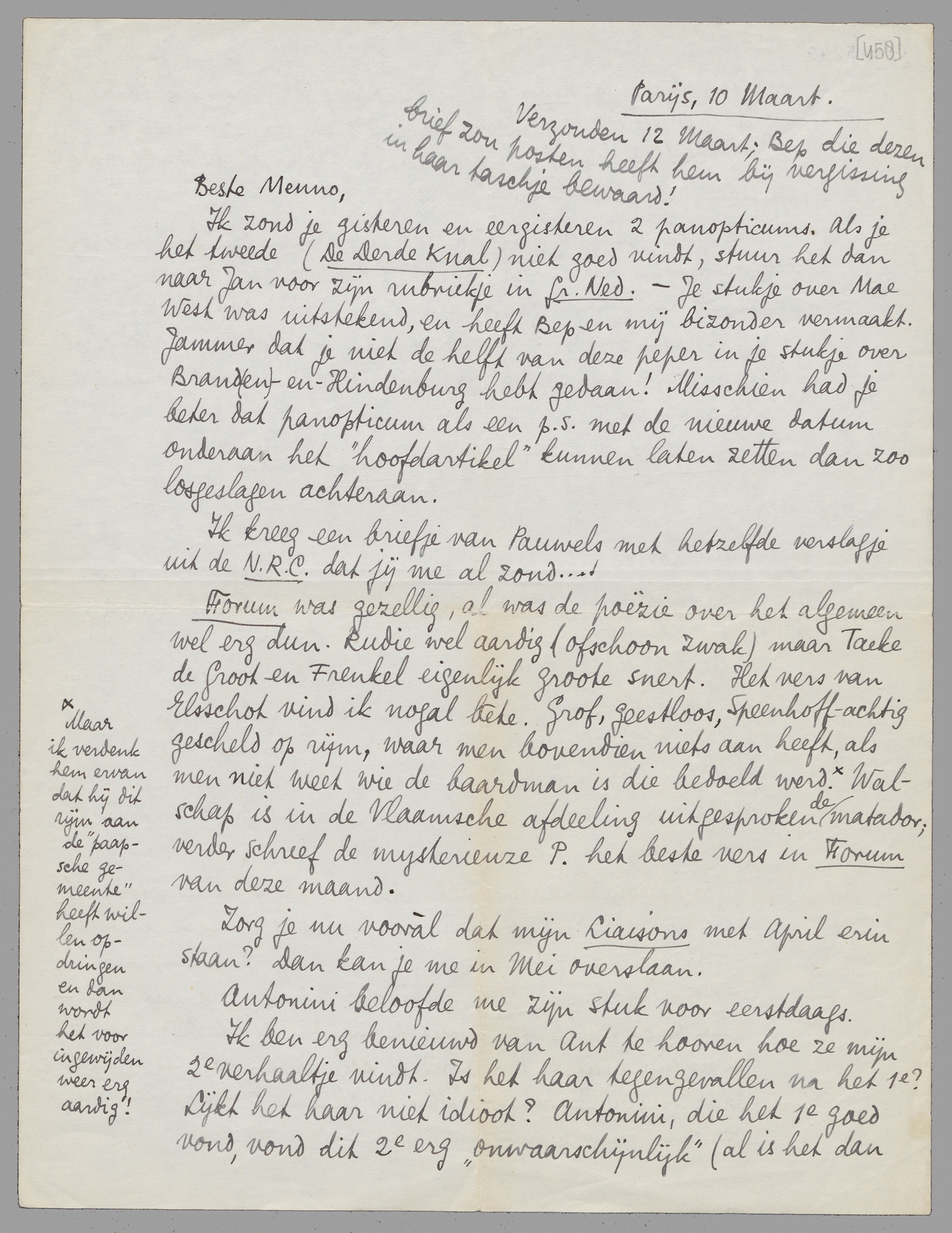Forum was gezellig, al was de poëzie over het algemeen wel erg dun. Rudie wel aardig (ofschoon zwak) maar Taeke de Groot en Frenkel eigenlijk groote snert. Het vers van Elsschot vind ik nogal bête. Grof, geestloos, Speenhoff-achtig gescheld op rijm, waar men bovendien niets aan heeft, als men niet weet wie de baardman is die bedoeld werd. [Maar ik verdenk hem ervan dat hij dit rijm aan de ‘paapsche gemeente’ heeft willen opdringen en dan wordt het voor ingewijden weer erg aardig!] Walschap is in de Vlaamsche afdeeling uitgesproken de matador; verder schreef de mysterieuze P. het beste vers in Forum van deze maand.