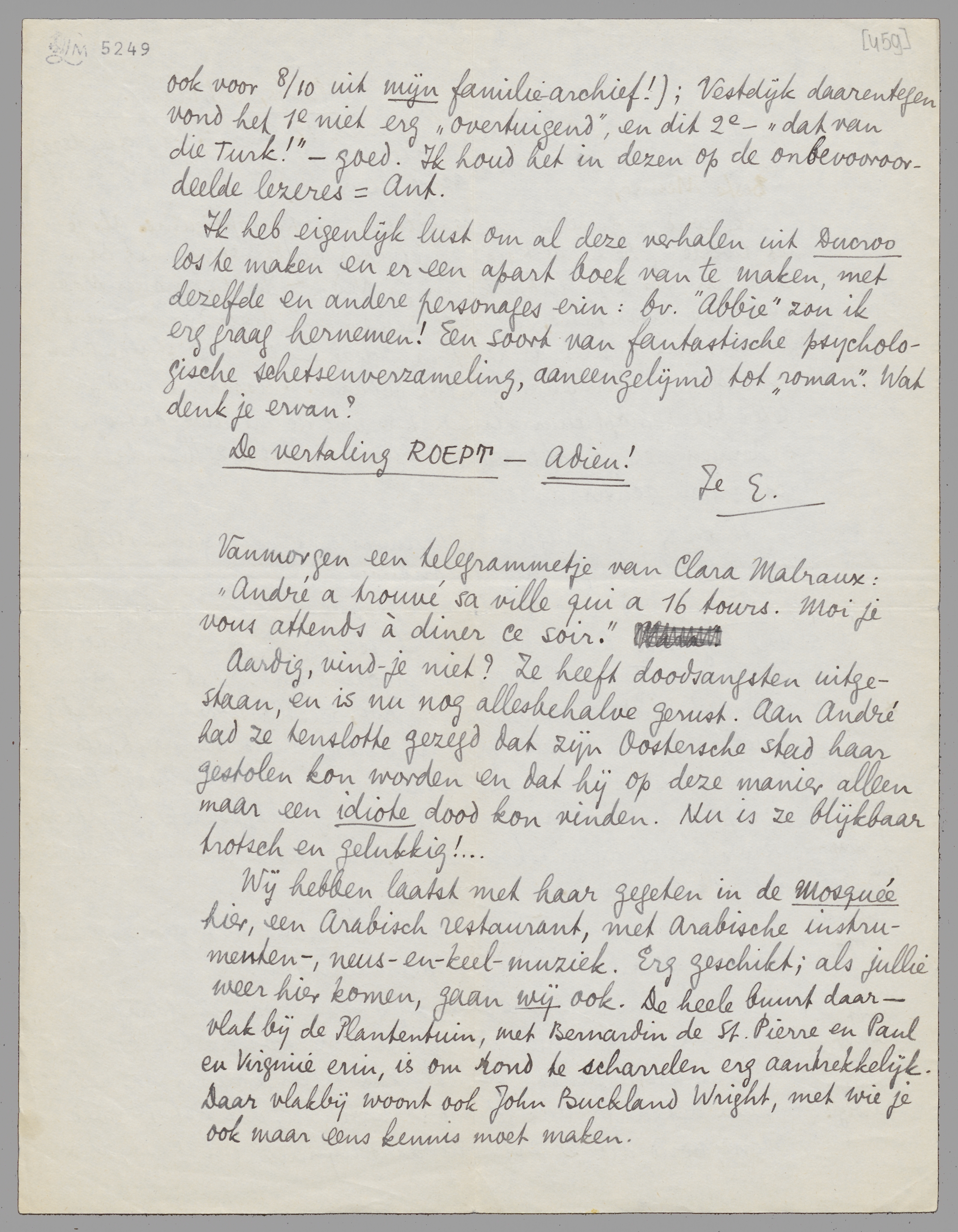 Vanmorgen een telegrammetje van Clara Malraux: ‘André a trouvé sa ville qui a 16 tours. Moi je vous attends à diner ce soir.’
