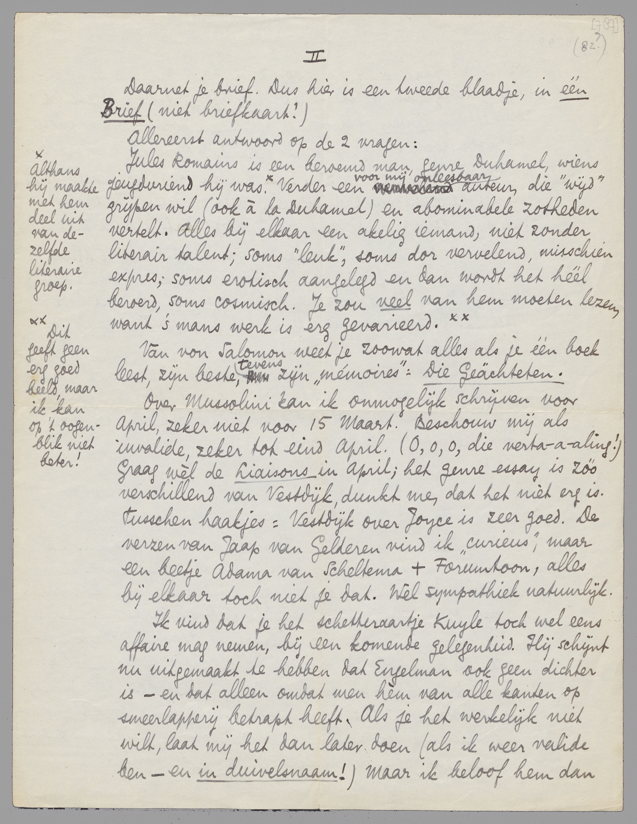 Over Mussolini kan ik onmogelijk schrijven voor April, zeker niet voor 15 Maart. Beschouw mij als invalide, zeker tot eind April. (O, o, o, die verta-a-aling!) Graag wèl de Liaisons in April; het genre essay is zóó verschillend van Vestdijk, dunkt me, dat het niet erg is. Tusschen haakjes: Vestdijk over Joyce is zeer goed. De verzen van Jaap van Gelderen vind ik ‘curieus’, maar een beetje Adama van Scheltema + Forumtoon, alles bij elkaar toch niet je dat. Wel sympathiek natuurlijk.