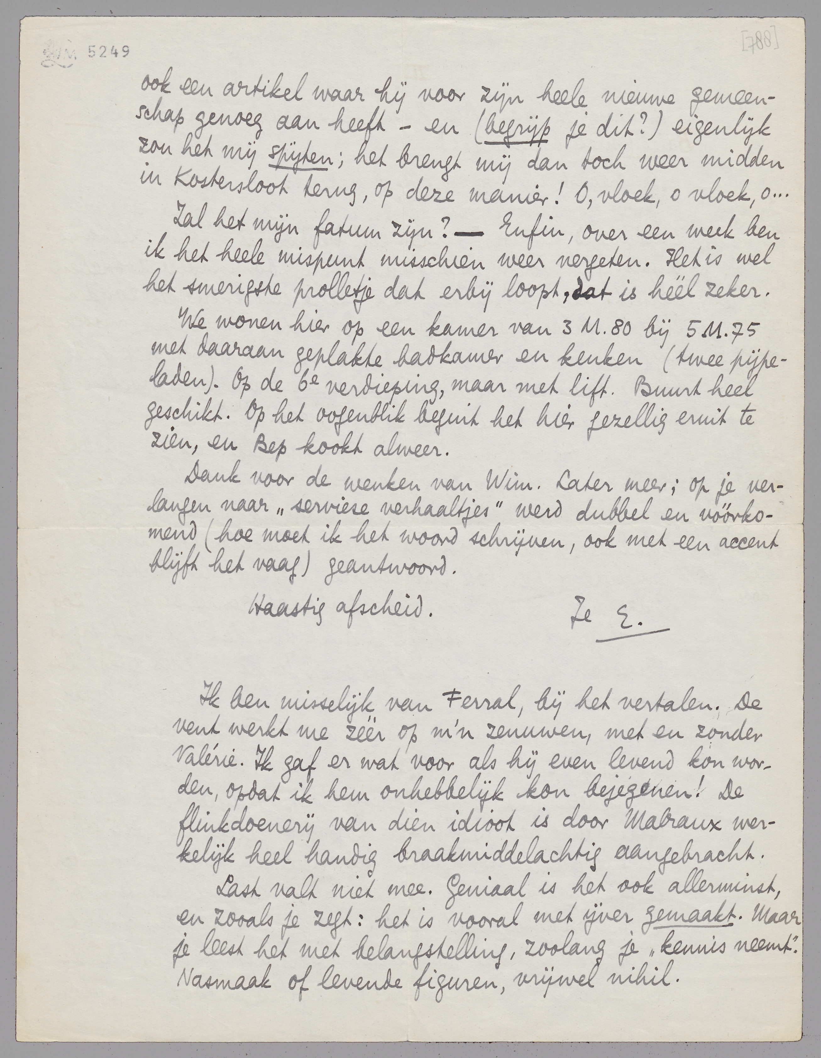Ik ben misselijk van Ferral, bij het vertalen. De vent werkt me zéér op m'n zenuwen, met en zonder Valérie. Ik gaf er wat voor als hij even levend kon worden, opdat ik hem onhebbelijk kon bejegenen! De flinkdoenerij van dien idioot is door Malraux werkelijk heel handig braakmiddelachtig aangebracht.