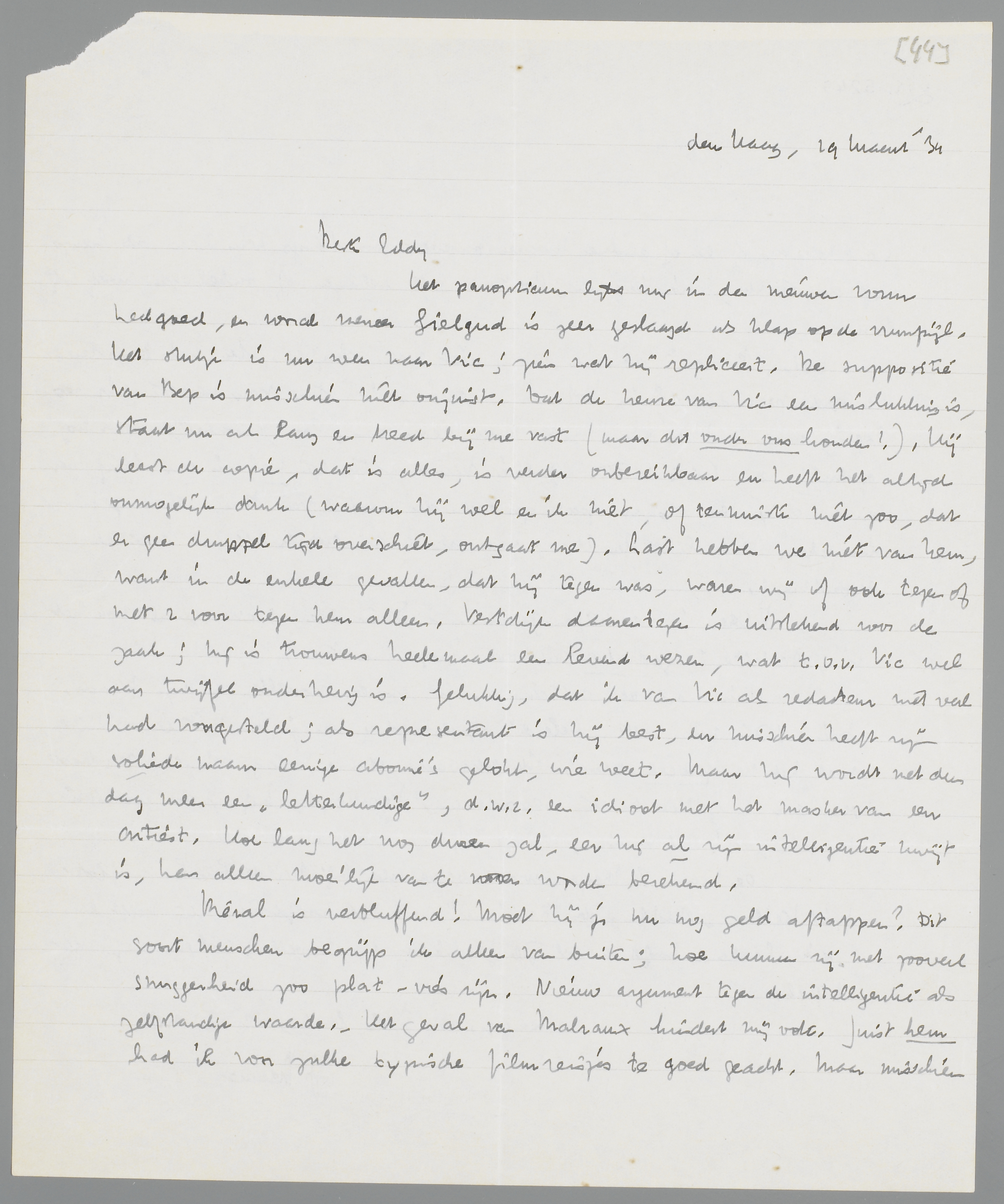 Méral is verbluffend! Moet hij je nu nog geld aftappen? Dit soort menschen begrijp ik alleen van buiten; hoe kunnen zij met zooveel snuggerheid zoo plat - vies zijn. Nieuw argument tegen de intelligentie als zelfstandige waarde. - Het geval van Malraux hindert mij ook. Juist hem had ik voor zulke typische filmreisjes te goed geacht. Maar misschien gaat het op of een of andere manier ongeveer zoo langs hem heen als langs mij de stukken, die ik aan ‘Cor’ en zijn belangen of onbelangen moet wijden.