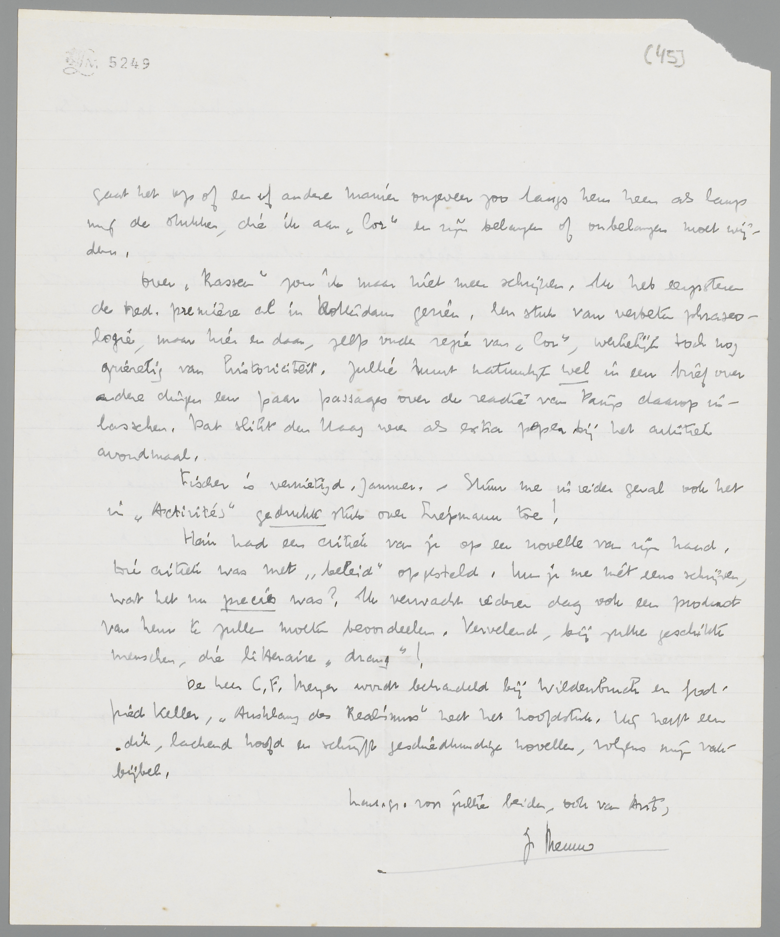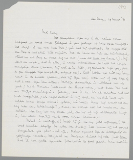 Over Rassen zou ik maar niet meer schrijven. Ik heb eergisteren de trad. première al in Rotterdam gezien. Een stuk van verbeten phraseologie, maar hier en daar, zelfs onder regie van ‘Cor’, werkelijk toch nog griezelig van historiciteit. Jullie kunt natuurlijk wel in een brief over andere dingen een paar passages over de reactie van Parijs daarop inlasschen. Dat slikt den Haag weer als extra peper bij het artistiek avondmaal.