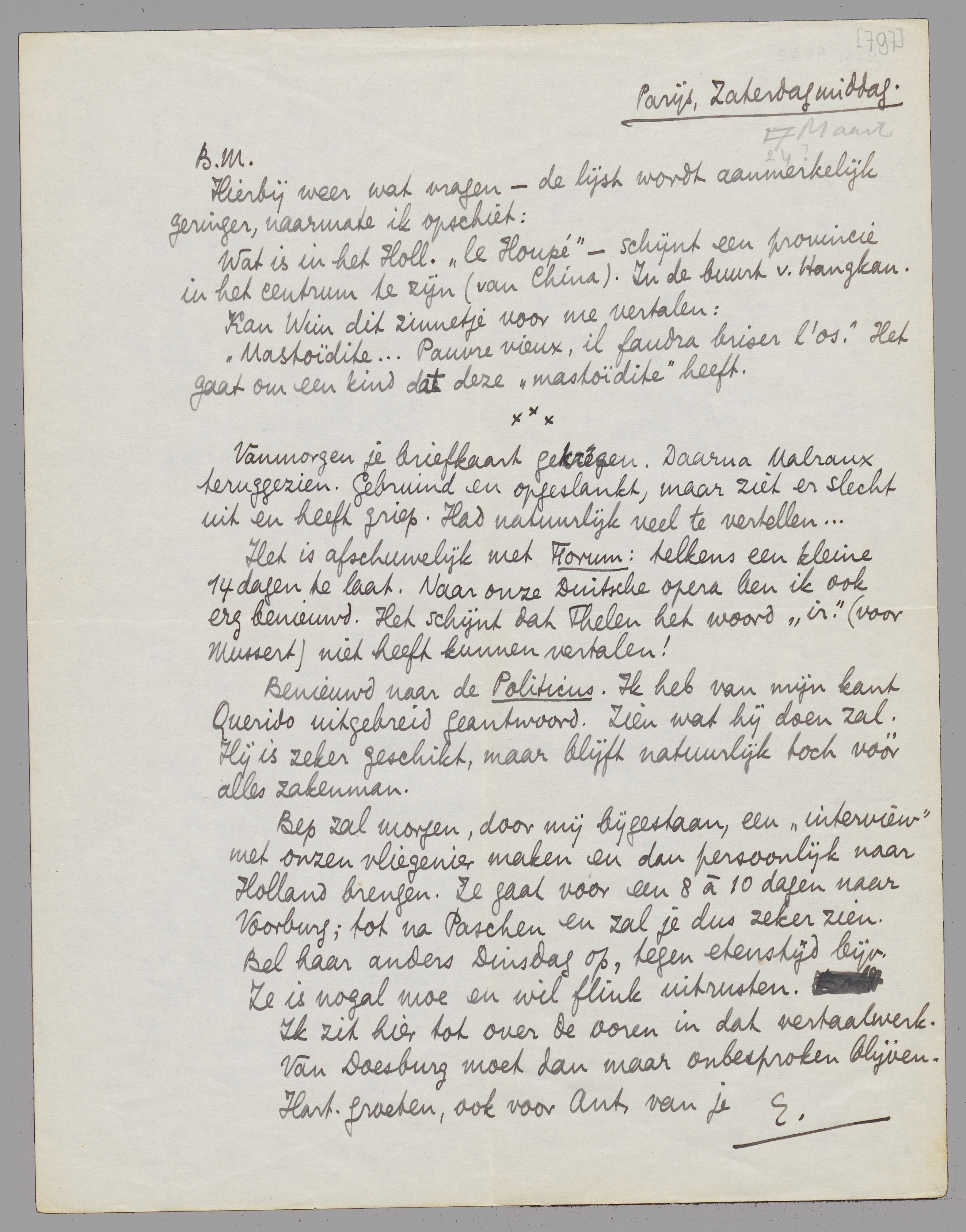 Vanmorgen je briefkaart gekregen. Daarna Malraux teruggezien. Gebruind en opgeslankt, maar ziet er slecht uit en heeft griep. Had natuurlijk veel te vertellen...