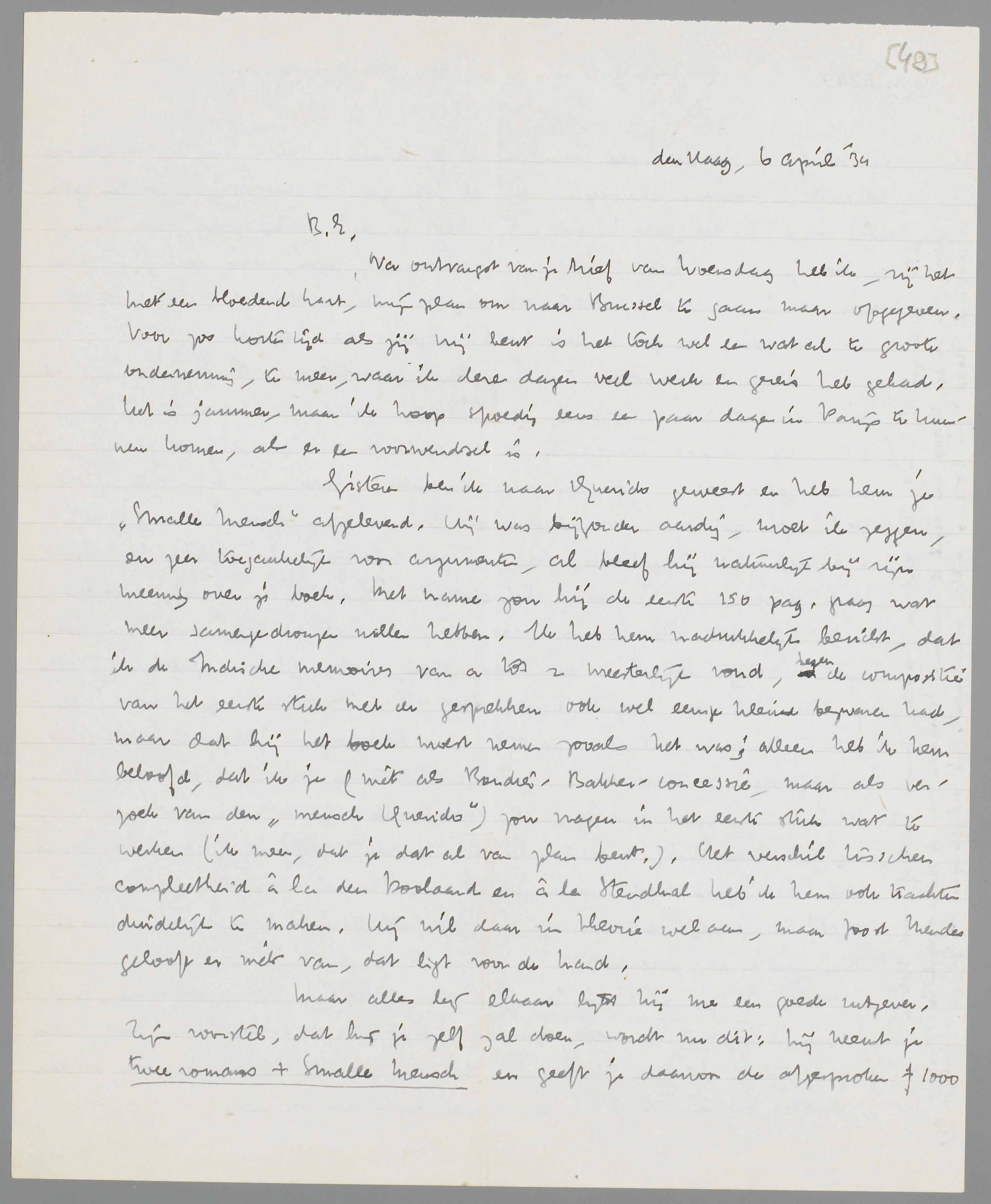 Gisteren ben ik naar Querido geweest en heb hem je Smalle Mensch afgeleverd. Hij was bijzonder aardig, moet ik zeggen, en zeer toegankelijk voor argumenten, al bleef hij natuurlijk bij zijn meening over je boek. Met name zou hij de eerste 150 pag. graag wat meer samengedrongen willen hebben. Ik heb hem nadrukkelijk bericht, dat ik de Indische memoires van a tot z meesterlijk vond, tegen de compositie van het eerste stuk met de gesprekken ook wel eenige kleine bezwaren had, maar dat hij het boek moest nemen zooals het was; alleen heb ik hem beloofd, dat ik je (niet als Boudier-Bakker-concessie, maar als verzoek van den ‘mensch Querido’) zou vragen in het eerste stuk wat te werken (ik meen, dat je dat al van plan bent.). Het verschil tusschen compleetheid à la den Doolaard en à la Stendhal heb ik hem ook trachten duidelijk te maken. Hij wil daar in theorie wel aan, maar Joost Mendes gelooft er niets van, dat ligt voor de hand.