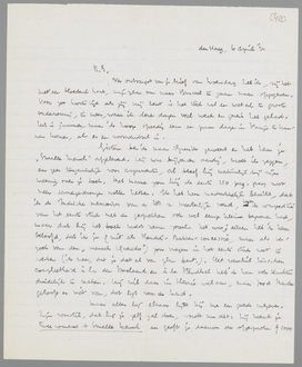 Na ontvangst van je brief van Woensdag heb ik, zij het met een bloedend hart, mijn plan om naar Brussel te gaan maar opgegeven. Voor zoo korte tijd als jij vrij bent is het toch wel een wat al te groote onderneming, te meer, waar ik deze dagen veel werk en gereis heb gehad. Het is jammer, maar ik hoop spoedig eens een paar dagen in Parijs te kunnen komen, als er een voorwendsel is.