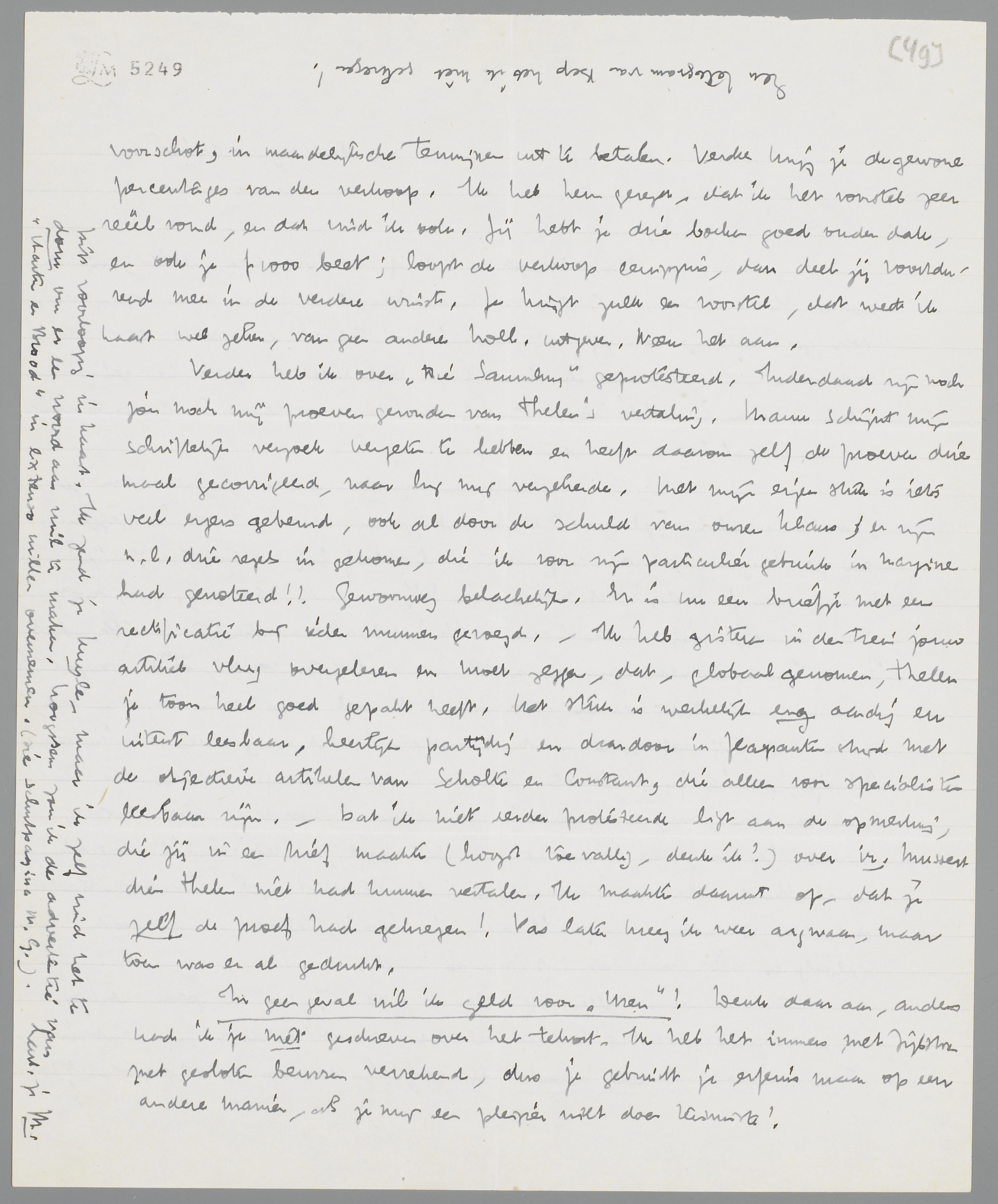 Verder heb ik over Die Sammlung geprotesteerd. Inderdaad zijn noch jou noch mij proeven gezonden van Thelen's vertaling. Mann schijnt mijn schriftelijk verzoek vergeten te hebben en heeft daarom zelf de proeven drie maal gecorrigeerd, naar hij mij verzekerde. Met mijn eigen stuk is iets veel ergers gebeurd, ook al door de schuld van onzen Klaus; er zijn n.l. drie regels in gekomen, die ik voor mijn particulier gebruik in margine had genoteerd!! Gewoonweg belachelijk. Er is nu een briefje met een rectificatie bij ieder nummer gevoegd. - Ik heb gisteren in den trein jouw artikel vlug overgelezen en moet zeggen, dat, globaal genomen, Thelen je toon heel goed gepakt heeft. Het stuk is werkelijk erg aardig en uiterst leesbaar, heerlijk partijdig en daardoor in flagranten strijd met de objectieve artikelen van Scholte en Constant, die alleen voor specialisten leesbaar zijn. - Dat ik niet eerder protesteerde ligt aan de opmerking, die jij in een brief maakte (hoogst toevallig, denk ik?) over ir. Mussert dien Thelen niet had kunnen vertalen. Ik maakte daaruit op, dat je zelf de proef had gekregen! Pas later kreeg ik weer argwaan, maar toen was er al gedrukt.