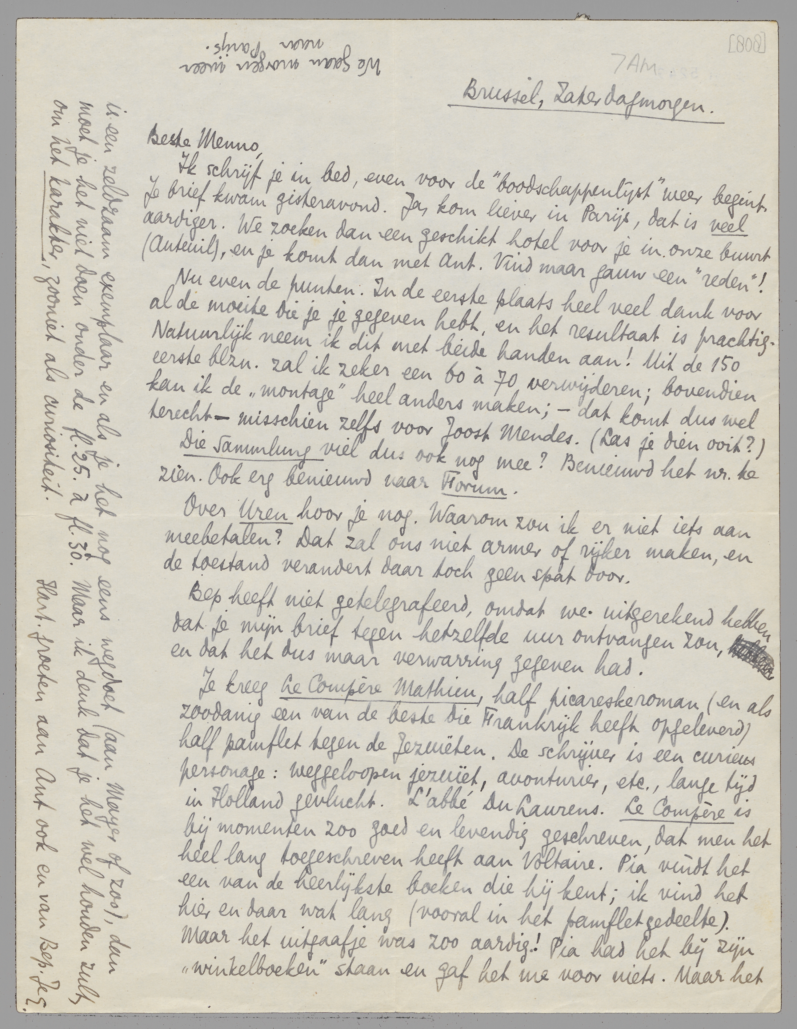 Ik schrijf je in bed, even voor de ‘boodschappenlijst’ weer begint. Je brief kwam gisteravond. Ja, kom liever in Parijs, dat is veel aardiger. We zoeken dan een geschikt hotel voor je in onze buurt (Auteuil), en je komt dan met Ant. Vind maar gauw een ‘reden’!