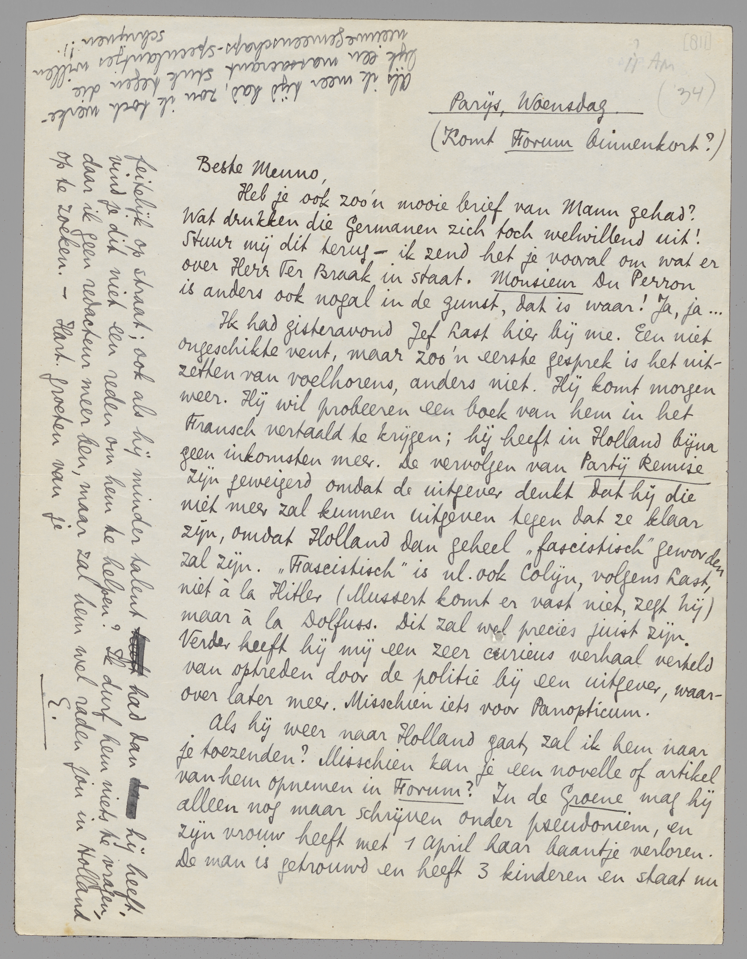 Heb je ook zoo'n mooie brief van Mann gehad? Wat drukken die Germanen zich toch welwillend uit! Stuur mij dit terug - ik zend het je vooral om wat er over Herr Ter Braak in staat. Monsieur Du Perron is anders ook nogal in de gunst, dat is waar! Ja, ja...
