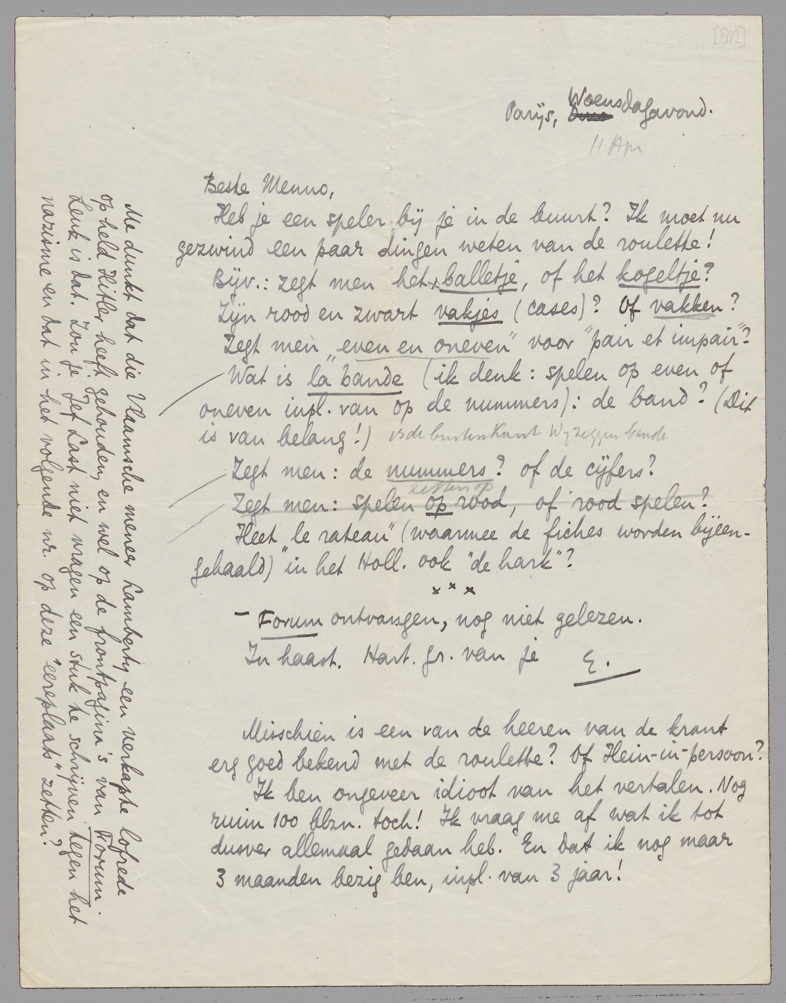 Ik ben ongeveer idioot van het vertalen. Nog ruim 100 blzn. toch! Ik vraag me af wat ik tot dusver allemaal gedaan heb. En dat ik nog maar 3 maanden bezig ben, inpl. van 3 jaar!