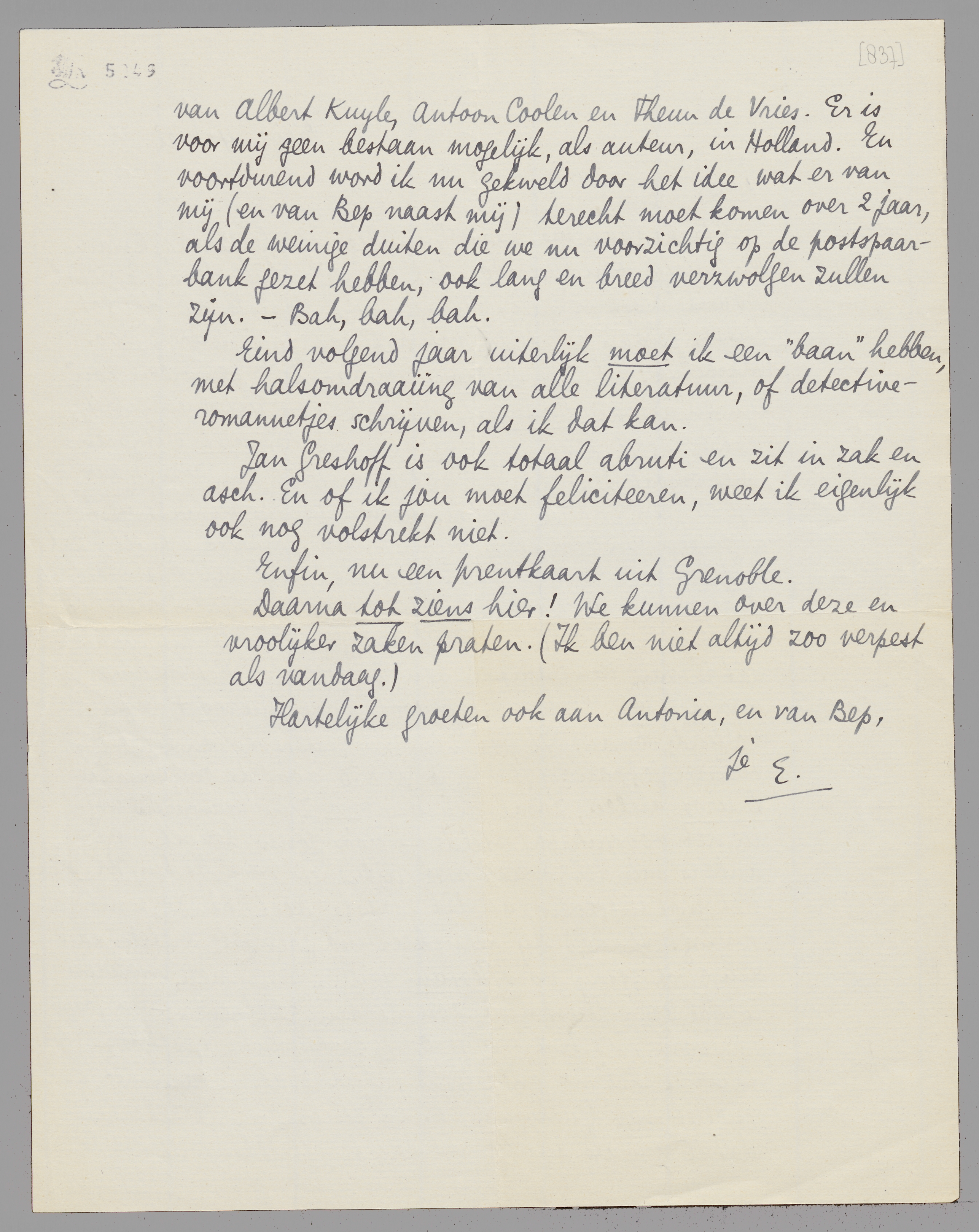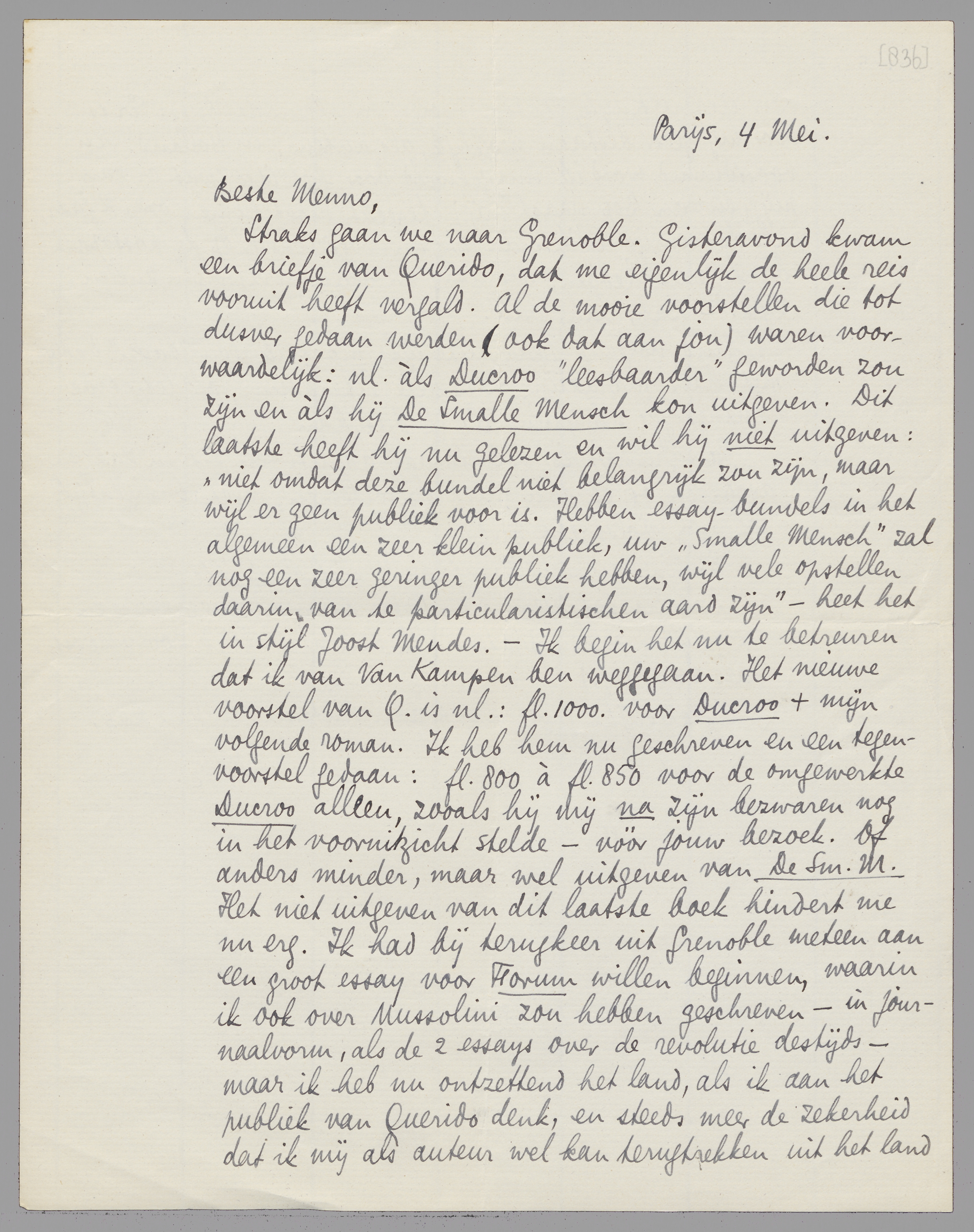Beste Menno, Straks gaan we naar Grenoble. Gisteravond kwam een briefje van Querido, dat me eigenlijk de heele reis vooruit heeft vergald. Al de mooie voorstellen die tot dusver gedaan werden (ook dat aan jou) waren voorwaardelijk: nl. àls Ducroo ‘leesbaarder’ geworden zou zijn en àls hij De Smalle Mensch kon uitgeven. Dit laatste heeft hij nu gelezen en wil hij niet uitgeven: ‘niet omdat deze bundel niet belangrijk zou zijn, maar wijl er geen publiek voor is. Hebben essaybundels in het algemeen een zeer klein publiek, uw Smalle Mensch zal nog een zeer geringer publiek hebben, wijl vele opstellen daarin van te particularistischen aard zijn’ - heet het in stijl Joost Mendes. - Ik begin het nu te betreuren dat ik van Van Kampen ben weggegaan. Het nieuwe voorstel van Q. is nl.: fl. 1000. voor Ducroo + mijn volgende roman. Ik heb hem nu geschreven en een tegenvoorstel gedaan: fl. 800 à fl. 850 voor de omgewerkte Ducroo alleen, zooals hij mij na zijn bezwaren nog in het vooruitzicht stelde - vóór jouw bezoek. Of anders minder, maar wel uitgeven van De Sm. M. Het niet uitgeven van dit laatste boek hindert me nu erg. Ik had bij terugkeer uit Grenoble meteen aan een groot essay voor Forum willen beginnen, waarin ik ook over Mussolini zou hebben geschreven - in journaalvorm, als de 2 essays over de revolutie destijds - maar ik heb nu ontzettend het land, als ik aan het publiek van Querido denk, en steeds meer de zekerheid dat ik mij als auteur wel kan terugtrekken uit het land van Albert Kuyle, Antoon Coolen en Theun de Vries. Er is voor mij geen bestaan mogelijk, als auteur, in Holland. En voortdurend word ik nu gekweld door het idee wat er van mij (en van Bep naast mij) terecht moet komen over 2 jaar, als de weinige duiten die we nu voorzichtig op de postspaarbank gezet hebben, ook lang en breed verzwolgen zullen zijn. - Bah, bah, bah.