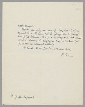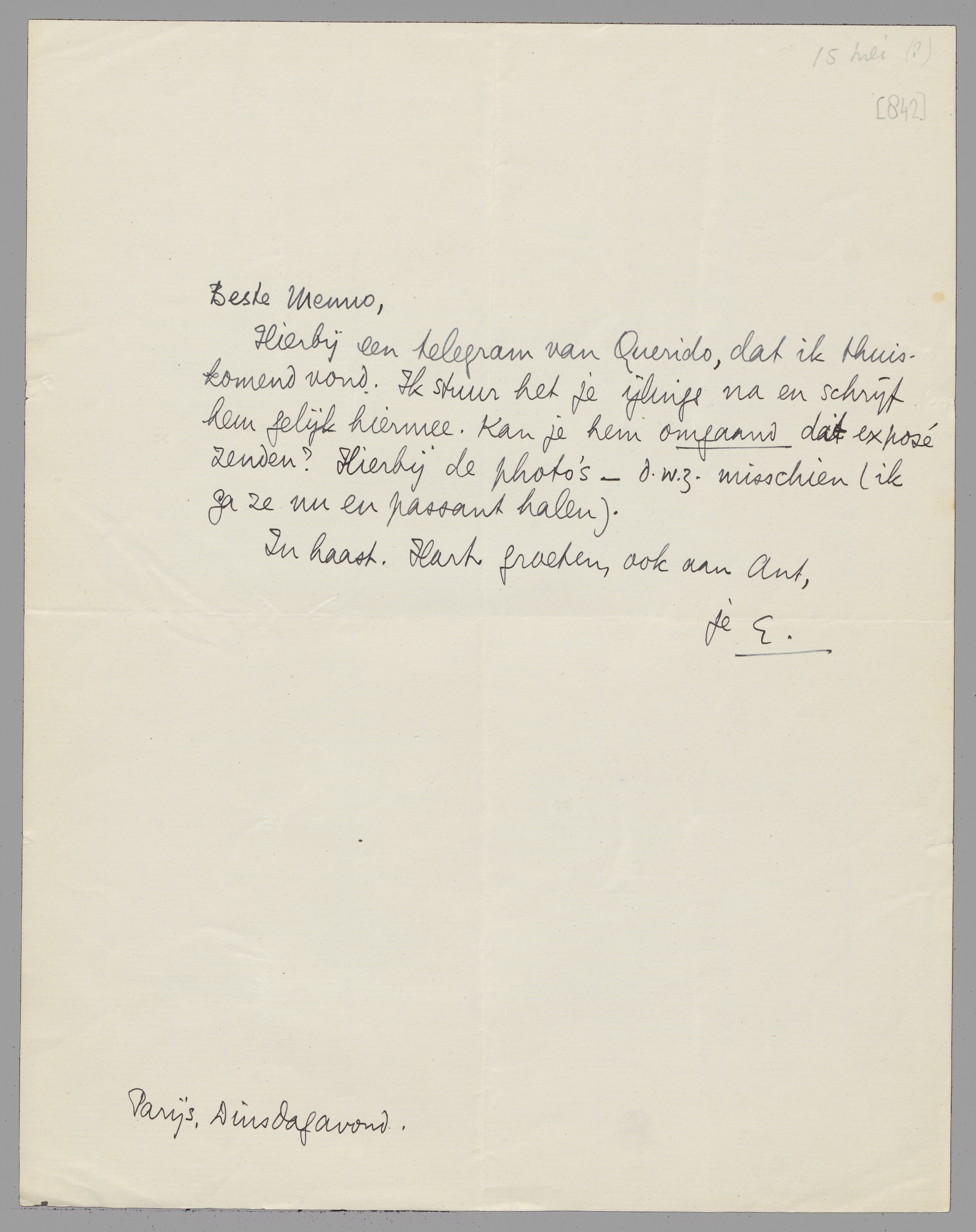 Hierbij een telegram van Querido, dat ik thuiskomend vond. Ik stuur het je ijlings na en schrijf hem gelijk hiermee. Kan je hem omgaand dat exposé zenden? Hierbij de photo's - d.w.z. misschien (ik ga ze nu en passant halen).