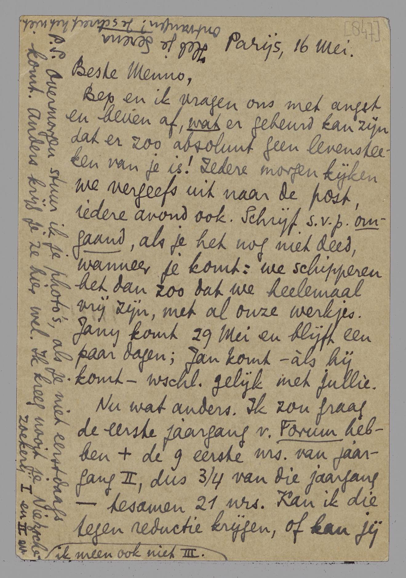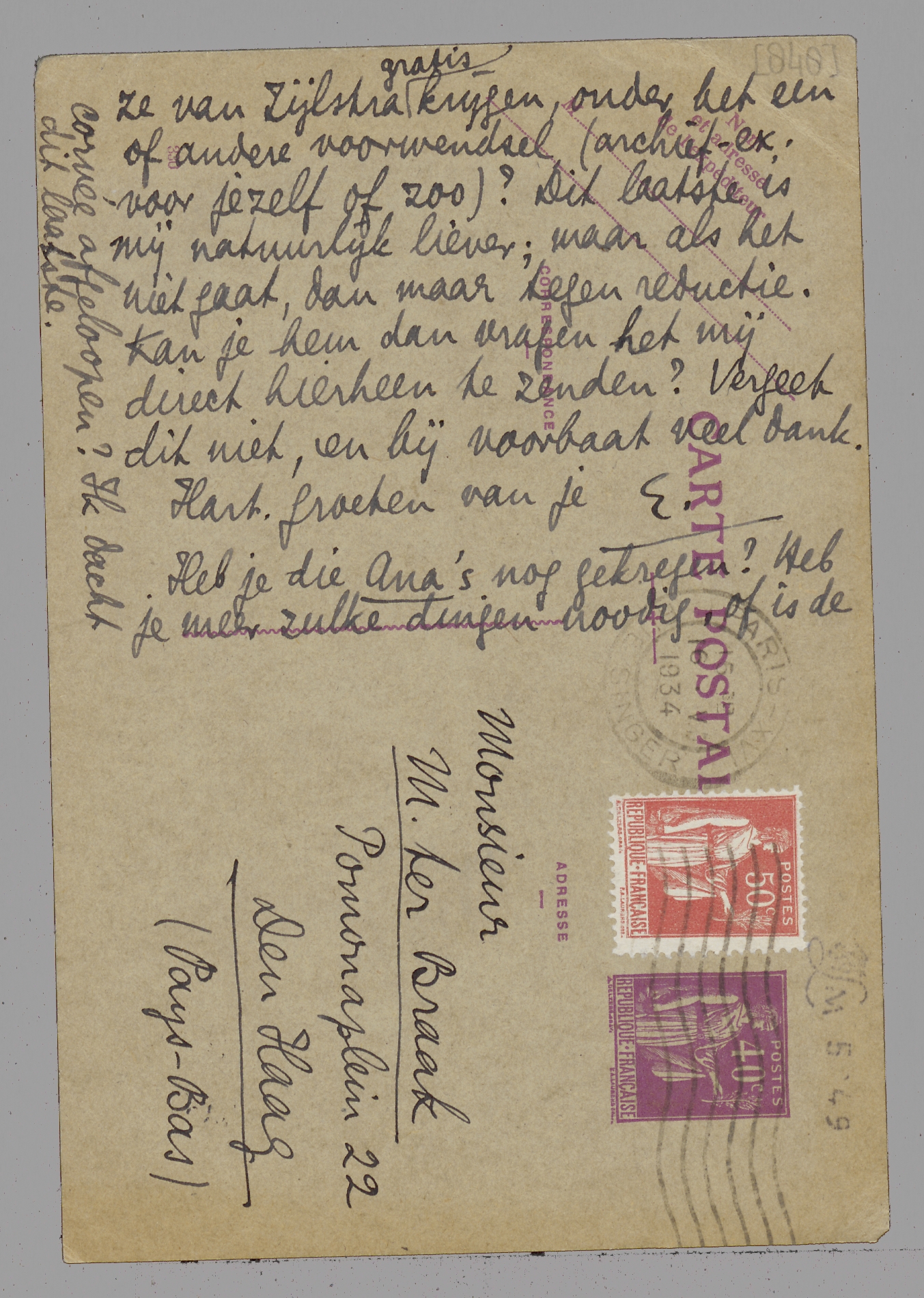 P.S. Overmorgen stuur ik je photo's, als je niet eerstdaags komt. Anders krijg je ze hier wel. Ik kreeg nooit je Nietzsche zoekerij I en II en ik meen ook niet III.