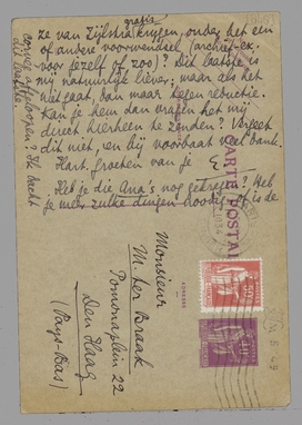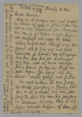 Bep en ik vragen ons met angst en beven af, wat er gebeurd kan zijn dat er zoo absoluut geen levensteeken van je is! Iedere morgen kijken we vergeefs uit naar de post, iedere avond ook. Schrijf s.v.p. omgaand, als je het nog niet deed, wanneer je komt: we schipperen het dan zoo dat we heelemaal vrij zijn, met al onze werkjes. Jany komt 29 Mei en blijft een paar dagen; Jan komt - àls hij komt - wschl. gelijk met jullie.