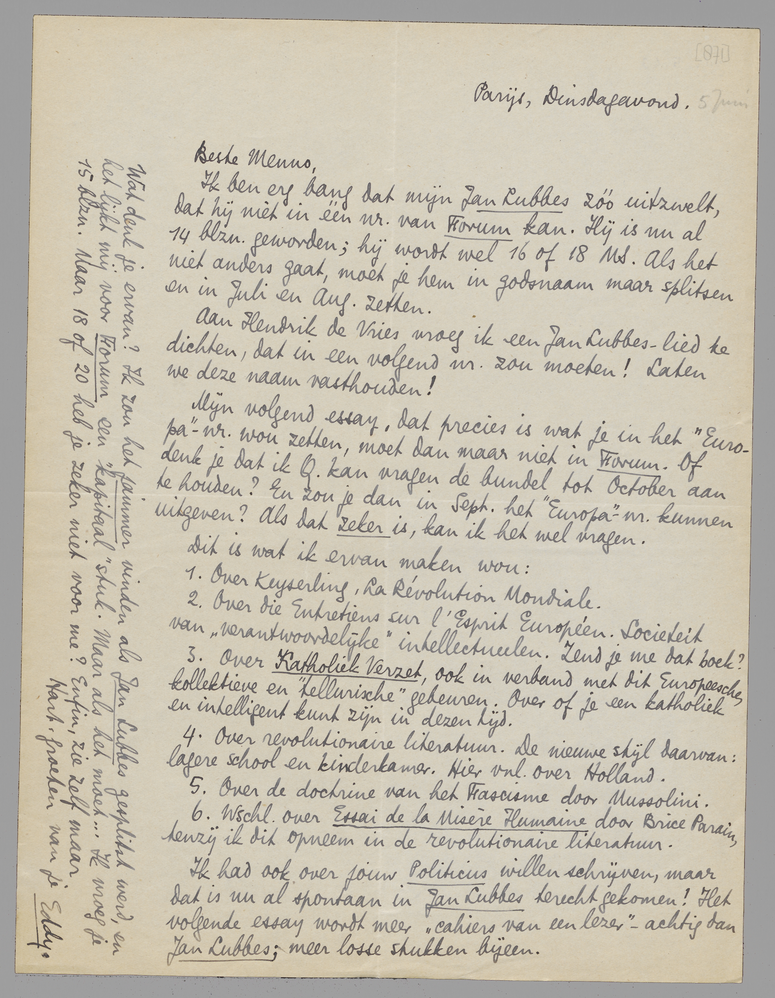 Mijn volgend essay, dat precies is wat je in het ‘Europa’-nr. wou zetten, moet dan maar niet in Forum. Of denk je dat ik Q. kan vragen de bundel tot October aan te houden? En zou je dan in Sept. het ‘Europa’-nr. kunnen uitgeven? Als dat zeker is, kan ik het wel vragen.
