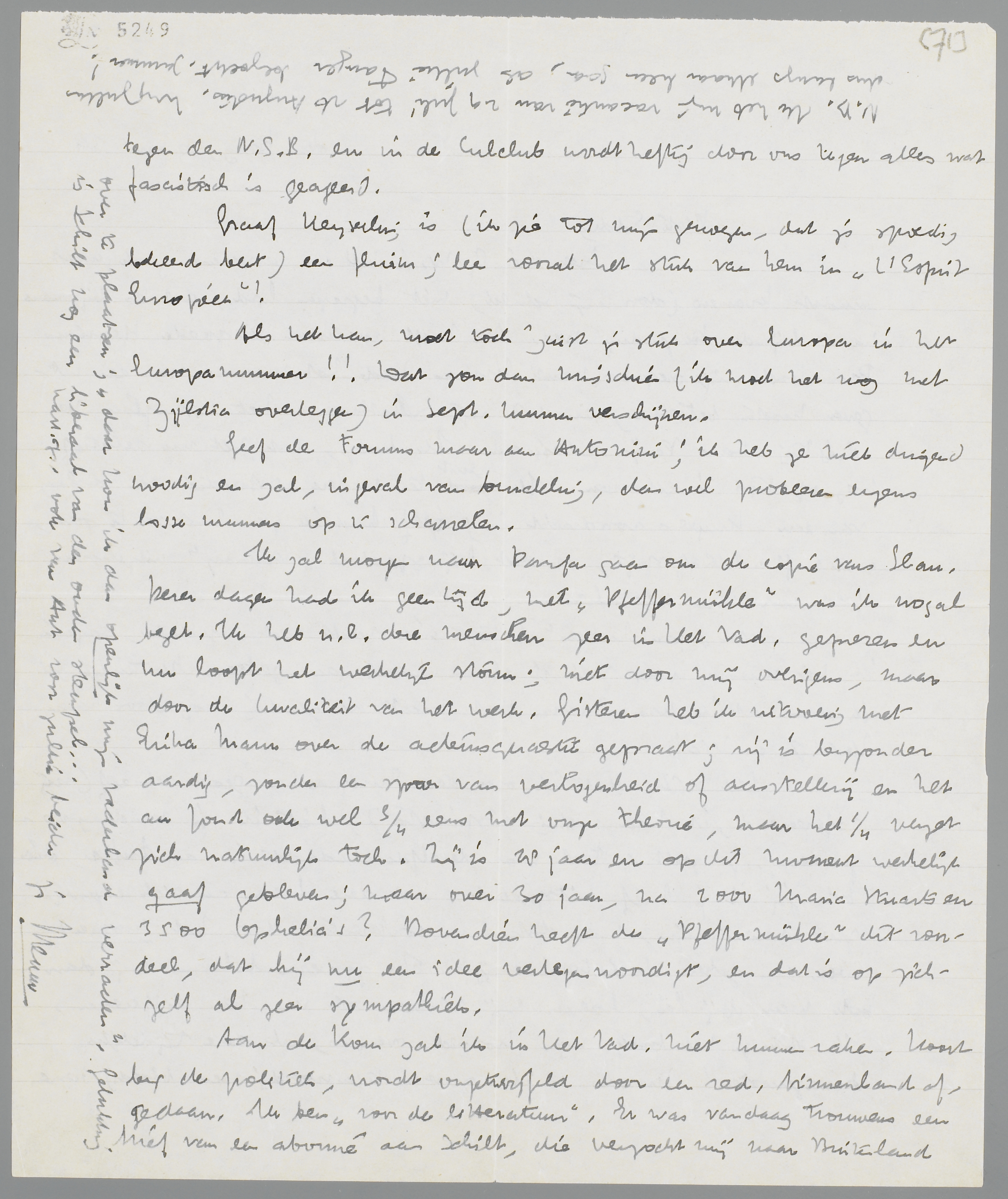 Het stuk, dat ik over den Europeeschen geest schreef (vrij refereerend, ik had weinig inspiratie), liet ik je vandaag opzenden. Je zult er toch nog dezelfde gedachte in aantreffen, die ook jij in je brief uitspreekt: dat deze heeren an sich eigenlijk zwamneuzen zijn, maar dat hun conferentie door het moment weer een zekere betekenis krijgt. In zooverre behooren wij dan ook weer bij hen, hoezeer wij verder ook van hen differeeren. Ik stuur je het boek nog. Komisch overigens, al deze tijdelijke bondgenooten! Kramers en ik zweren tegenwoordig weer bloedig samen tegen den N.S.B. en in de Culclub wordt heftig door ons tegen alles wat fascistisch is geageerd.
