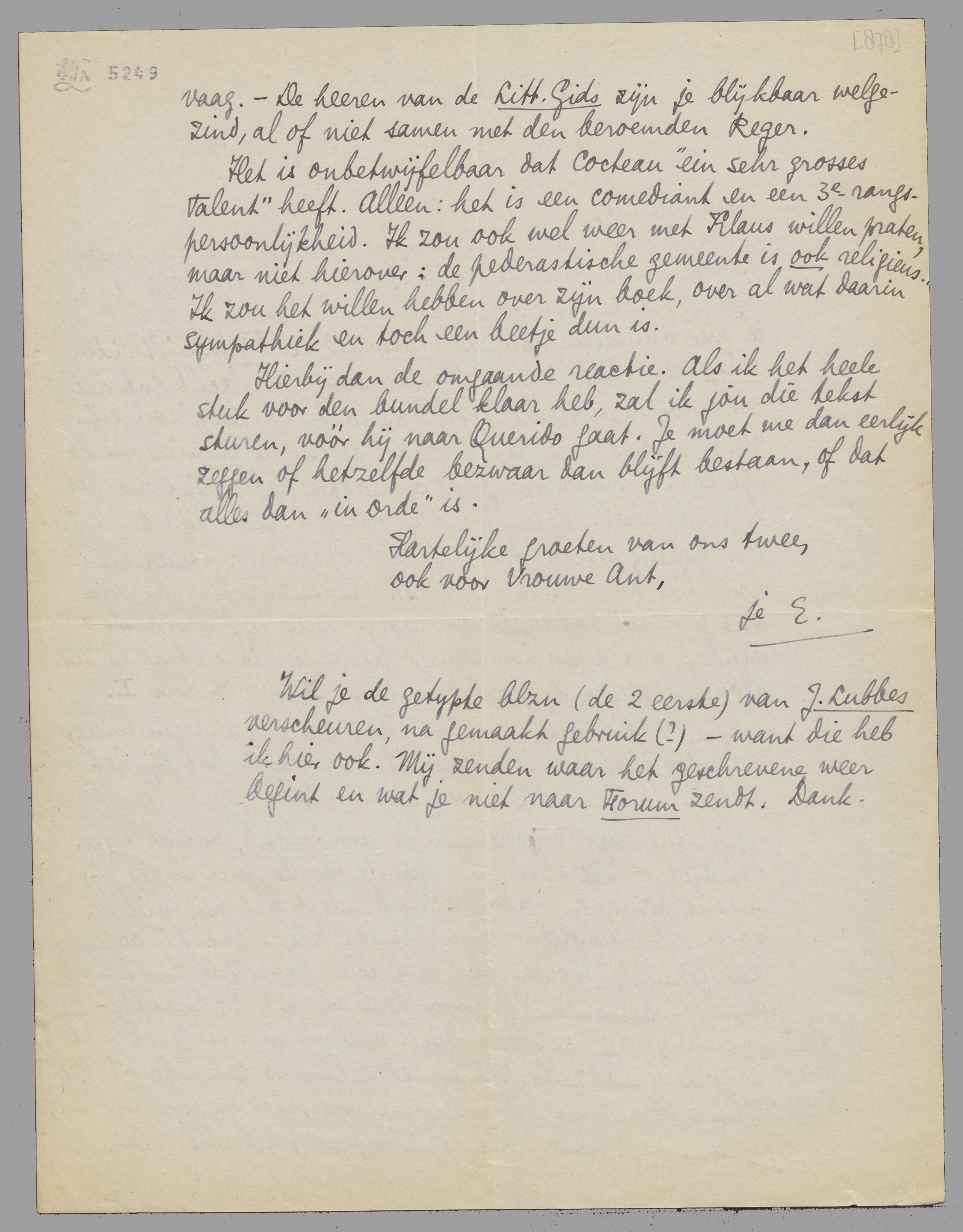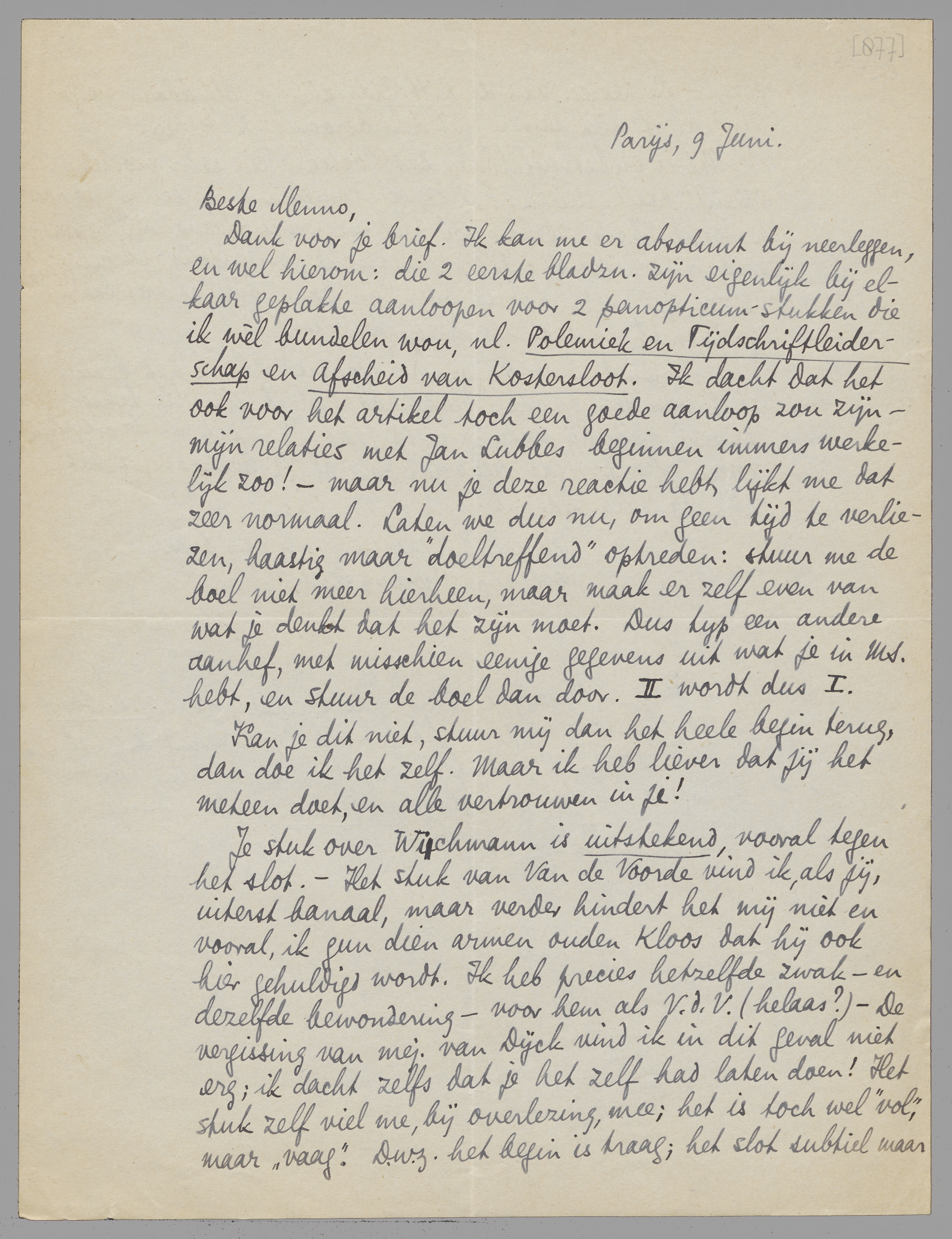 Hierbij dan de omgaande reactie. Als ik het heele stuk voor den bundel klaar heb, zal ik jou die tekst sturen, vóór hij naar Querido gaat. Je moet me dan eerlijk zeggen of hetzelfde bezwaar dan blijft bestaan, of dat alles dan ‘in orde’ is.