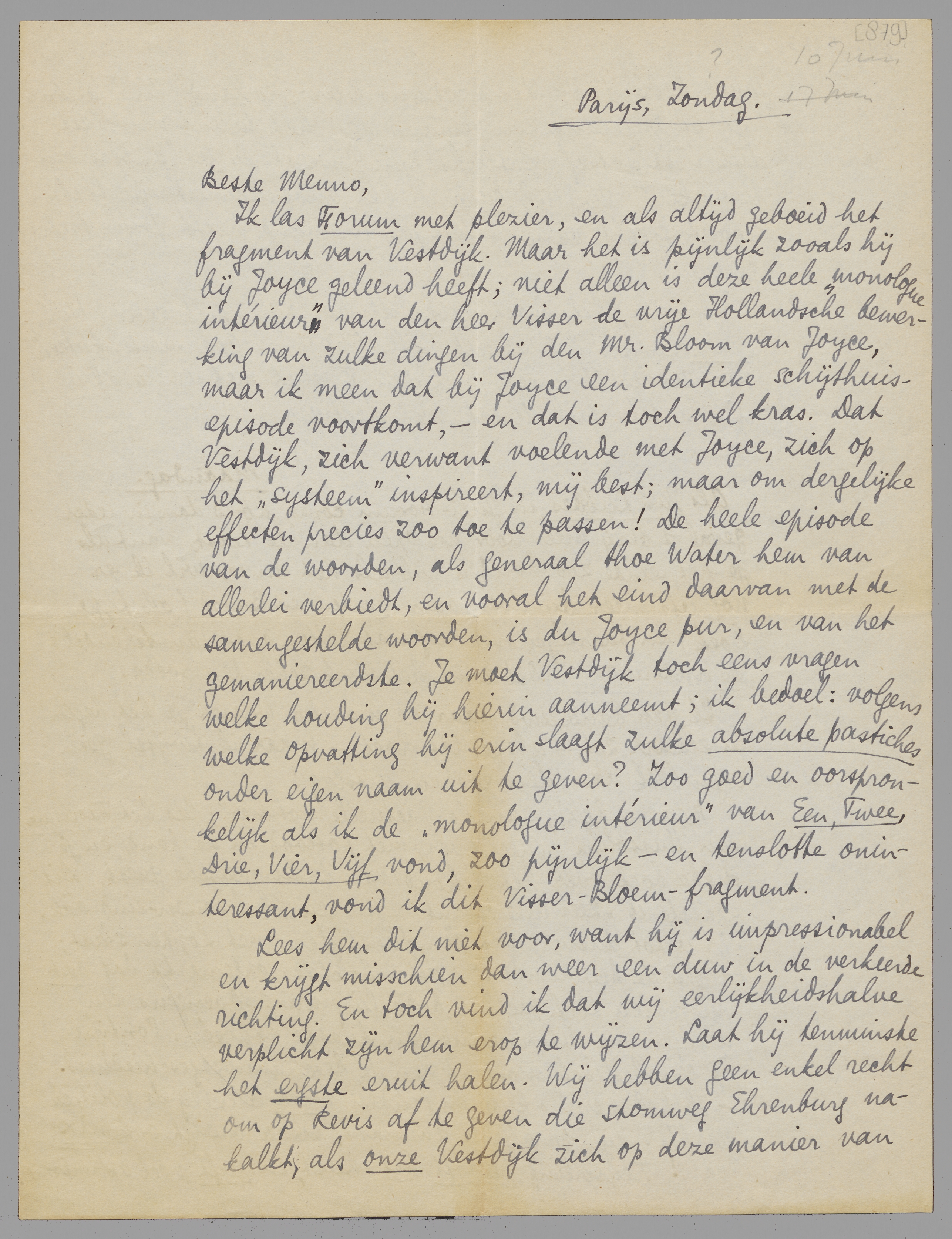 Ik las Forum met plezier, en als altijd geboeid het fragment van Vestdijk. Maar het is pijnlijk zooals hij bij Joyce geleend heeft; niet alleen is deze heele ‘monologue intérieur’ van den heer Visser de vrije Hollandsche bewerking van zulke dingen bij den Mr. Bloom van Joyce, maar ik meen dat bij Joyce een identieke schijthuisepisode voorkomt, - en dat is toch wel kras. Dat Vestdijk, zich verwant voelende met Joyce, zich op het ‘systeem’ inspireert, mij best; maar om dergelijke effecten precies zoo toe te passen! De heele episode van de woorden, als generaal thoe Water hem van allerlei verbiedt, en vooral het eind daarvan met de samengestelde woorden, is du Joyce pur, en van het gemaniereerdste. Je moet Vestdijk toch eens vragen welke houding hij hierin aanneemt; ik bedoel: volgens welke opvatting hij erin slaagt zulke absolute pastiches onder eigen naam uit te geven? Zoo goed en oorspronkelijk als ik de ‘monologue intérieur’ van Een, Twee, Drie, Vier, Vijf vond, zoo pijnlijk - en tenslotte oninteressant, vond ik dit Visser-Bloemfragment.