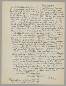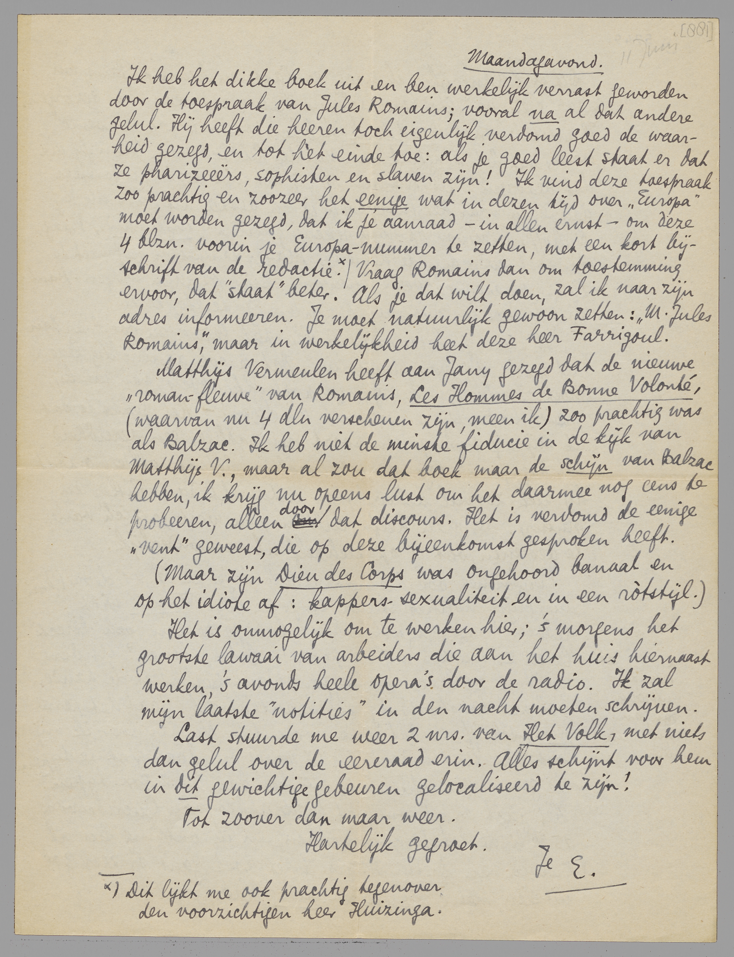 Ik heb het dikke boek uit en ben werkelijk verrast geworden door de toespraak van Jules Romains; vooral na al dat andere gelul. Hij heeft die heeren toch eigenlijk verdomd goed de waarheid gezegd, en tot het einde toe: als je goed leest staat er dat ze pharizeeërs, sophisten en slaven zijn! Ik vind deze toespraak zoo prachtig en zoozeer het eenige wat in dezen tijd over ‘Europa’ moet worden gezegd, dat ik je aanraad - in allen ernst om deze 4 blzn. voorin je Europa-nummer te zetten, met een kort bijschrift van de redactie. [Dit lijkt me ook prachtig tegenover den voorzichtigen heer Huizinga.] Vraag Romains dan om toestemming ervoor, dat ‘staat’ beter. Als je dat wilt doen, zal ik naar zijn adres informeeren. Je moet natuurlijk gewoon zetten: ‘M. Jules Romains’, maar in werkelijkheid heet deze heer Farrigoul.