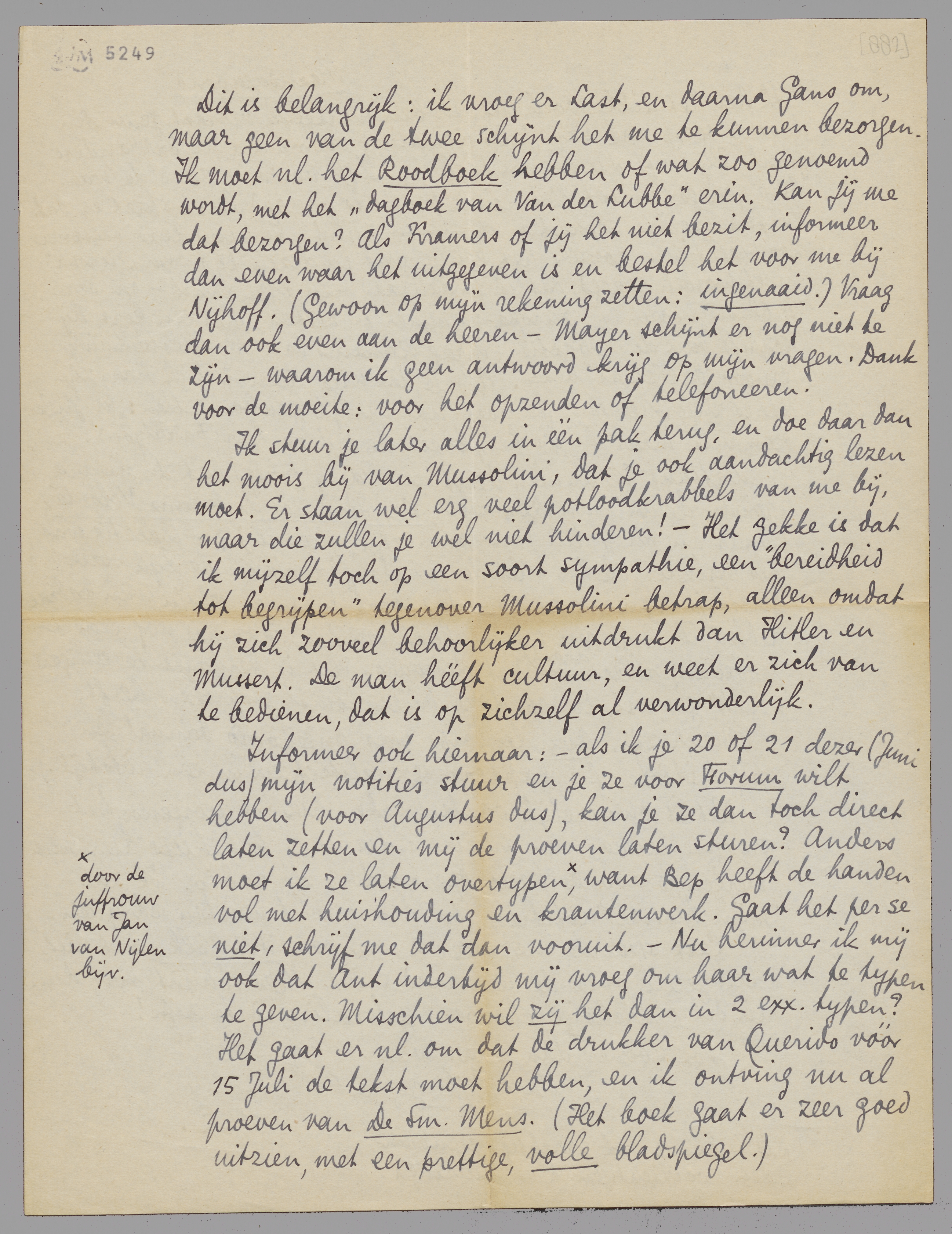 Dit is belangrijk: ik vroeg er Last, en daarna Gans om, maar geen van de twee schijnt het me te kunnen bezorgen. Ik moet nl. het Roodboek hebben of wat zoo genoemd wordt, met het ‘dagboek van Van der Lubbe’ erin. Kan jij me dat bezorgen? Als Kramers of jij het niet bezit, informeer dan even waar het uitgegeven is en bestel het voor me bij Nijhoff. (Gewoon op mijn rekening zetten: ingenaaid.) Vraag dan ook even aan de heeren - Mayer schijnt er nog niet te zijn - waarom ik geen antwoord krijg op mijn vragen. Dank voor de moeite: voor het opzenden of telefoneeren.