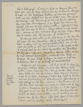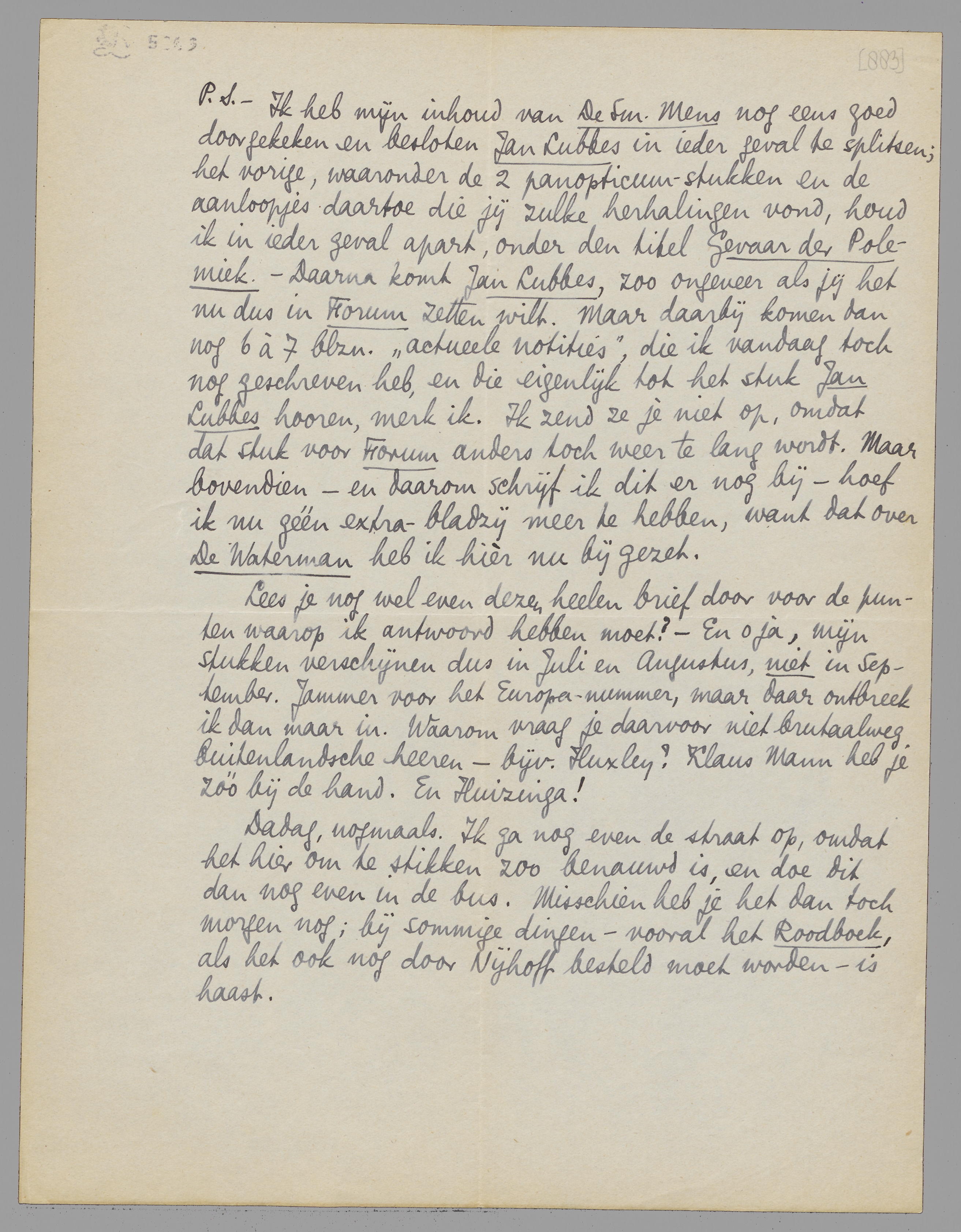P.S. - Ik heb mijn inhoud van De Sm. Mens nog eens goed doorgekeken en besloten Jan Lubbes in ieder geval te splitsen; het vorige, waaronder de 2 panopticum-stukken en de aanloopjes daartoe die jij zulke herhalingen vond, houd ik in ieder geval apart, onder den titel Gevaar der Polemiek. - Daarna komt Jan Lubbes, zoo ongeveer als jij het nu dus in Forum zetten wilt. Maar daarbij komen dan nog 6 à 7 blzn. ‘actueele notities’, die ik vandaag toch nog geschreven heb, en die eigenlijk tot het stuk Jan Lubbes hooren, merk ik. Ik zend ze je niet op, omdat dat stuk voor Forum anders toch weer te lang wordt. Maar bovendien - en daarom schrijf ik dit er nog bij - hoef ik nu géén extra-bladzij meer te hebben, want dat over De Waterman heb ik hièr nu bij gezet.