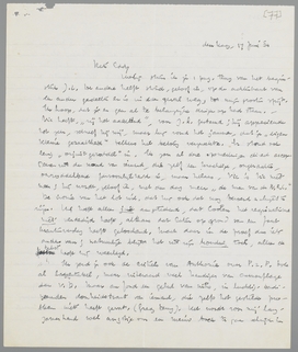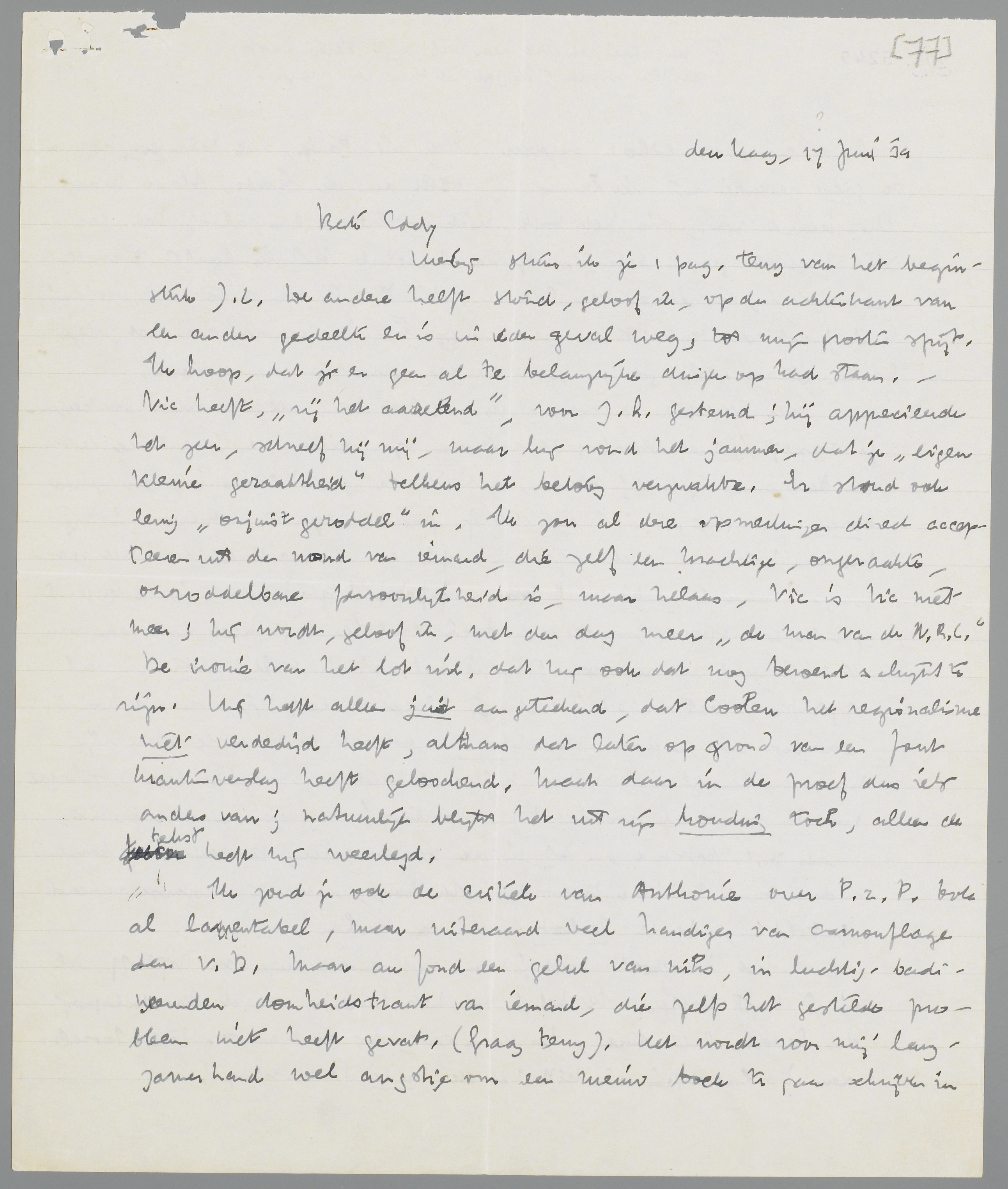 Hierbij stuur ik je 1 pag. terug van het beginstuk J.L. De andere helft stond, geloof ik, op den achterkant van een ander gedeelte en is in ieder geval weg, tot mijn grooten spijt. Ik hoop, dat je er geen al te belangrijke dingen op had staan. - Vic heeft, ‘zij het aarzelend’, voor J.L. gestemd; hij apprecieerde het zeer, schreef hij mij, maar hij vond het jammer, dat je ‘eigen kleine geraaktheid’ telkens het betoog verzwakte. Er stond ook eenig ‘onjuist geroddel’ in. Ik zou al deze opmerkingen direct accepteeren uit den mond van iemand, die zelf een krachtige, ongeraakte, onroddelbare persoonlijkheid is, maar helaas, Vic is Vic niet meer; hij wordt, geloof ik, met den dag meer ‘de man van de N.R.C.’. De ironie van het lot wil, dat hij ook dat nog beroerd schijnt te zijn. Hij heeft alleen juist aangeteekend, dat Coolen het regionalisme niet verdedigd heeft, althans dat later op grond van een fout krantenverslag heeft geloochend. Maak daar in de proef dus iets anders van; natuurlijk blijkt het uit zijn houding toch, alleen de tekst heeft hij weerlegd.