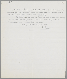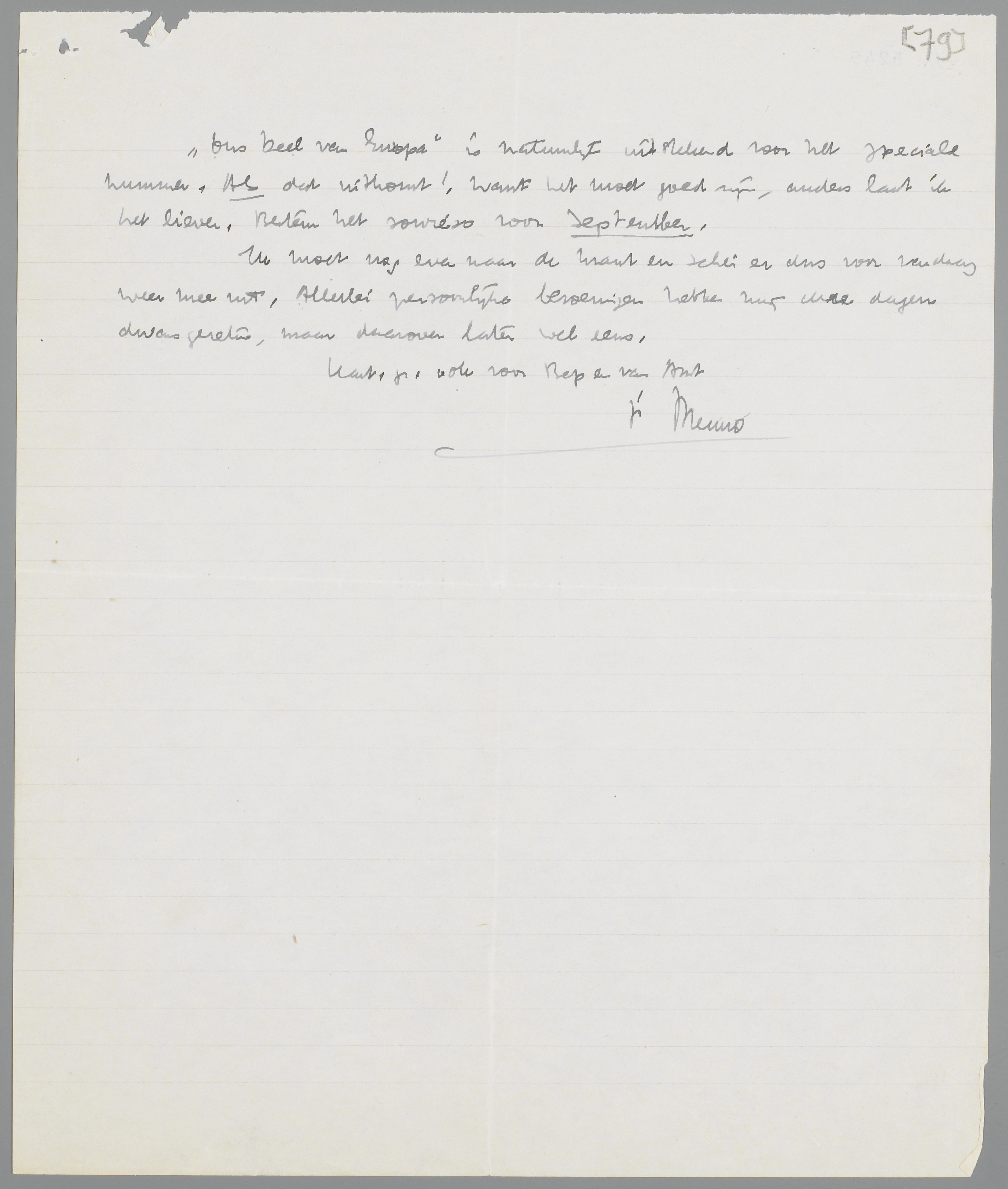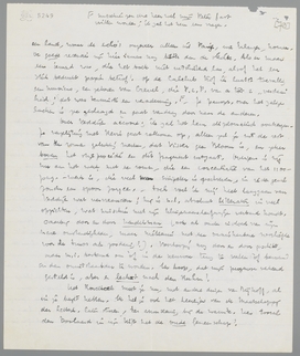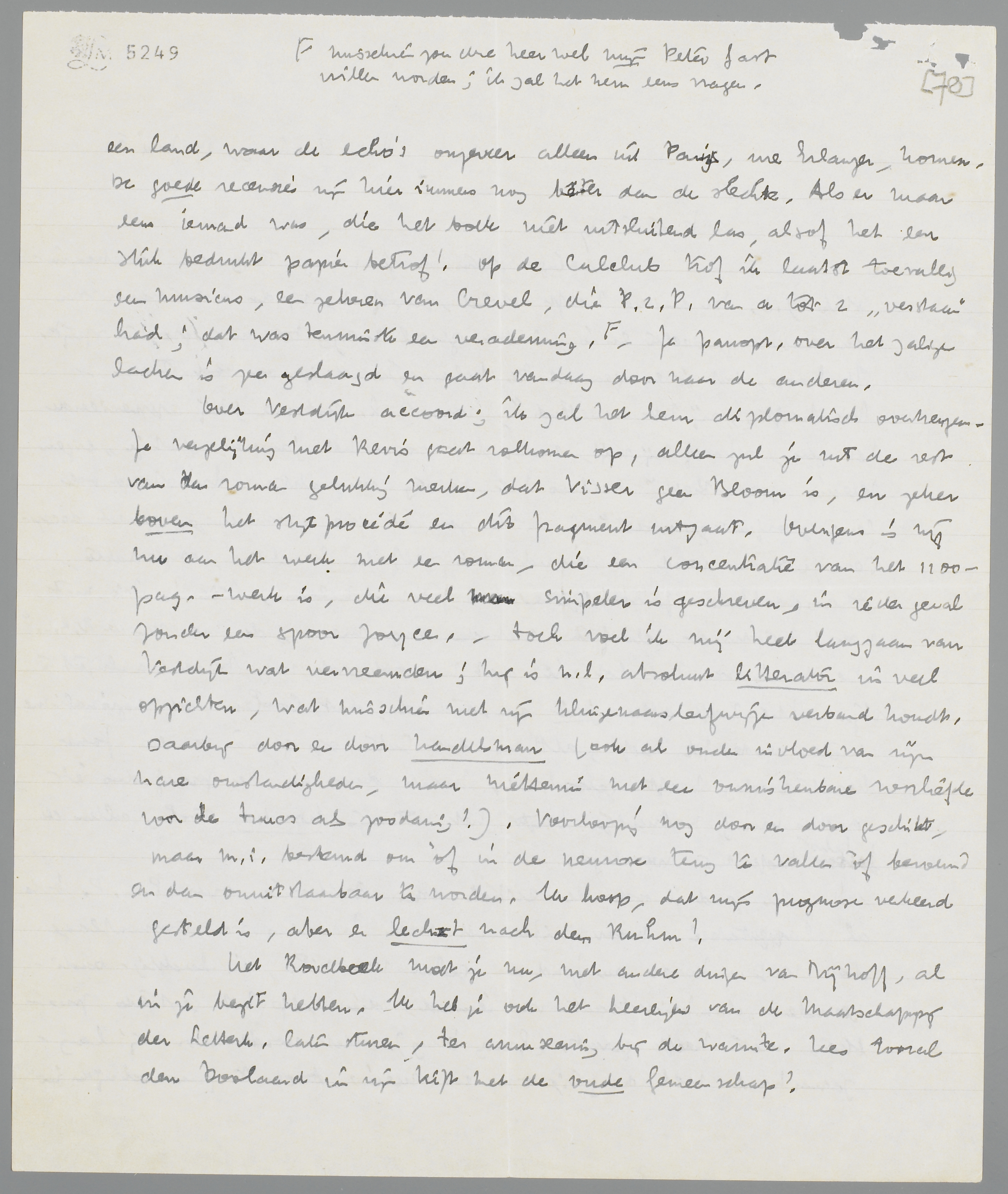 Ik zond je ook de critiek van Anthonie over P.z.P. Ook al lamentabel, maar uiteraard veel handiger van camouflage dan v.D. Maar au fond een gelul van niks, in luchtig badineerenden domheidstrant van iemand, die zelfs het gestelde probleem niet heeft gevat. (Graag terug). Het wordt voor mij langzamerhand wel angstig om een nieuw boek te gaan schrijven in een land, waar de echo's ongeveer alleen uit Parijs, rue Erlanger, komen. De goede recensies zijn hier immers nog bêter dan de slechte. Als er maar eens iemand was, die het boek niet uitsluitend las, alsof het een stuk bedrukt papier betrof! Op de Culclub trof ik laatst toevallig een musicus, een zekeren van Crevel, die P.z.P. van a tot z ‘verstaan’ had; dat was tenminste een verademing. [Misschien zou die heer wel mijn Peter Gast willen worden; ik zal het hem eens vragen.] Je panopt. over het zalige lachen is zeer geslaagd en gaat vandaag door naar de anderen.