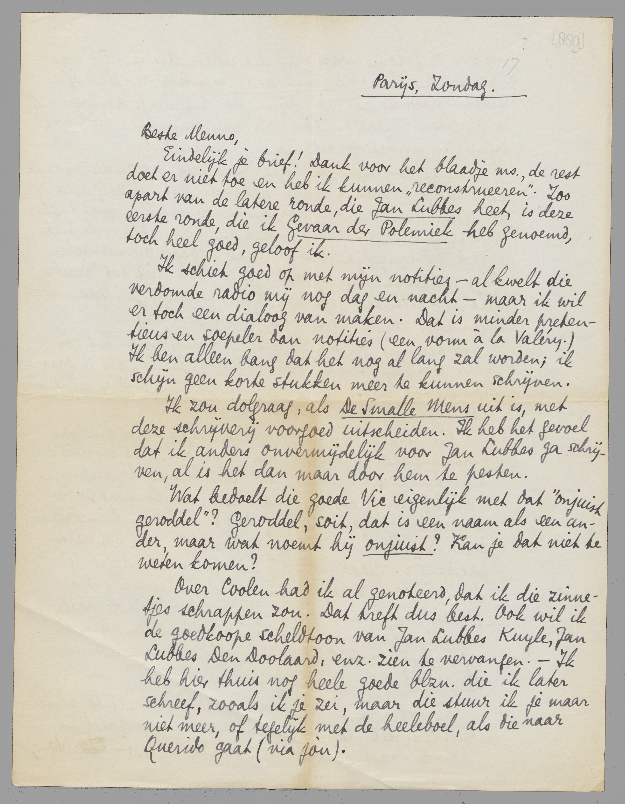 Eindelijk je brief! Dank voor het blaadje ms., de rest doet er niet niet toe en heb ik kunnen ‘reconstrueeren’. Zoo apart van de latere ronde, die Jan Lubbes heet, is deze eerste ronde, die ik Gevaar der Polemiek heb genoemd, toch heel goed, geloof ik.