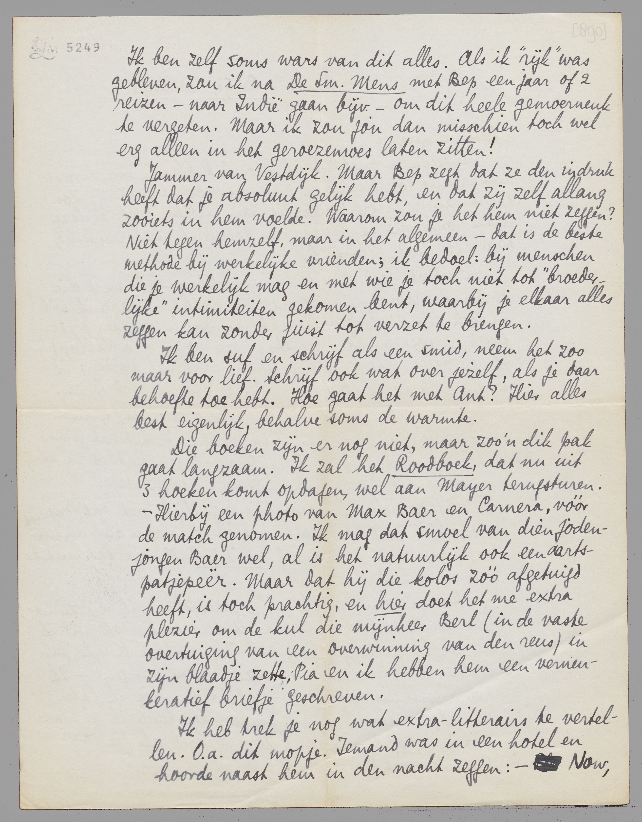 Die boeken zijn er nog niet, maar zoo'n dik pak gaat langzaam. Ik zal het Roodboek, dat nu uit 3 hoeken komt opdagen, wel aan Mayer terugsturen. - Hierbij een photo van Max Baer en Carnera, vóór de match genomen. Ik mag dat smoel van dien jodenjongen Baer wel, al is het natuurlijk ook een aartspatjepeër. Maar dat hij die kolos zóó afgetuigd heeft, is toch prachtig, en hier doet het me extra plezier om de kul die mijnheer Berl (in de vaste overtuiging van een overwinning van den reus) in zijn blaadje zette, Pia en ik hebben hem een verneukeratief briefje geschreven.