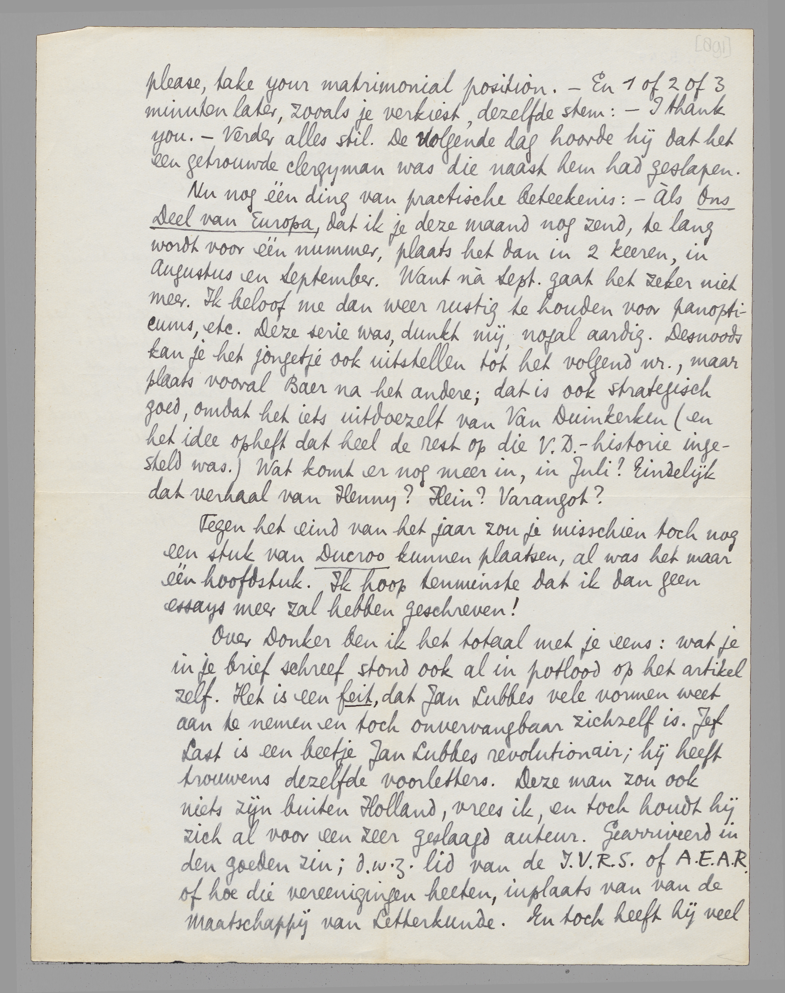 Over Donker ben ik het totaal met je eens: wat je in je brief schreef stond ook al in potlood op het artikel zelf. Het is een feit, dat Jan Lubbes vele vormen weet aan te nemen en toch onvervangbaar zichzelf is. Jef Last is een beetje Jan Lubbes revolutionair; hij heeft trouwens dezelfde voorletters. Deze man zou ook niets zijn buiten Holland, vrees ik, en toch houdt hij zich al voor een zeer geslaagd auteur. Gearriveerd in den goeden zin; d.w.z. lid van de I.V.R.S. of A.E.A.R. of hoe die vereenigingen heeten, inplaats van van de Maatschappij van Letterkunde. En toch heeft hij veel geschikts, evenals ongetwijfeld - voor wie met hem bevriend kan blijven - Jan Lubbes Donkersloot.