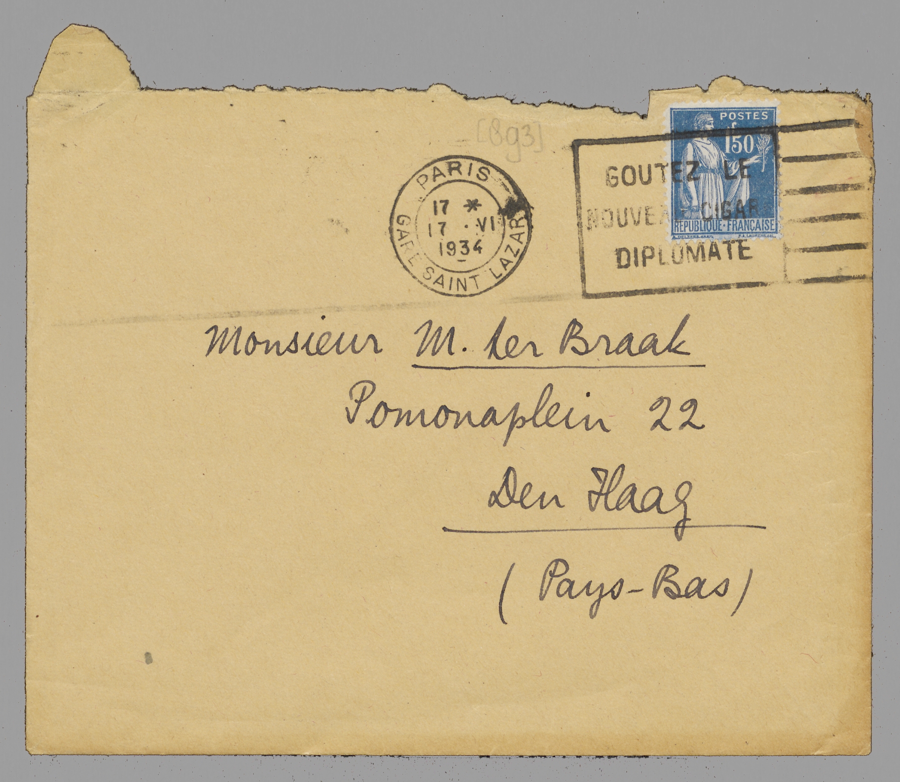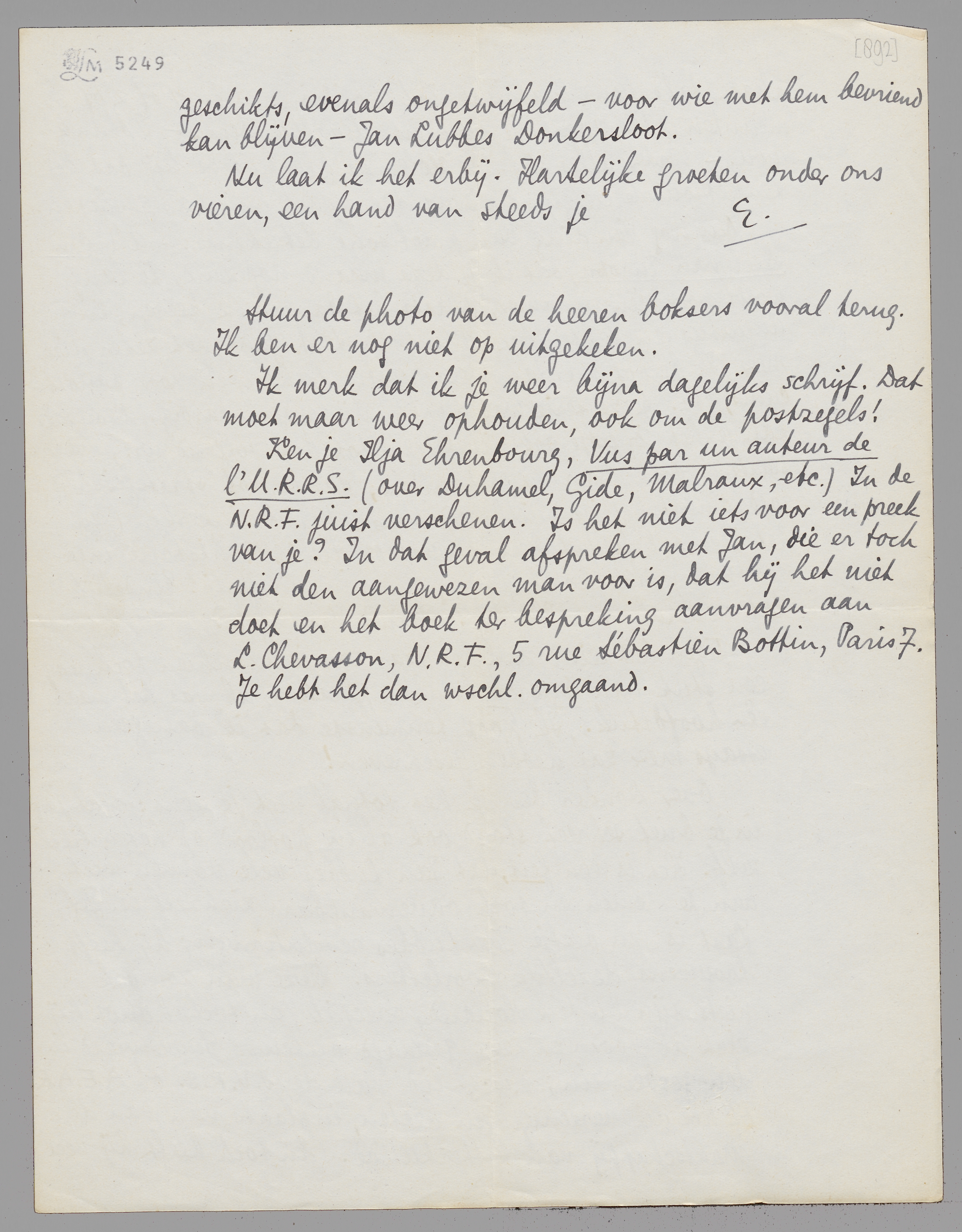 Ken je Ilja Ehrenbourg, Vus par un auteur de l'U.R.R.S. (over Duhamel, Gide, Malraux, etc.) In de N.R.F. juist verschenen. Is het niet iets voor een preek van je? In dat geval afspreken met Jan, die er toch niet den aangewezen man voor is, dat hij het niet doet en het boek ter bespreking aanvragen aan L. Chevasson, N.R.F., 5 rue Sébastien Bottin, Paris 7. Je hebt het dan wschl. omgaand.